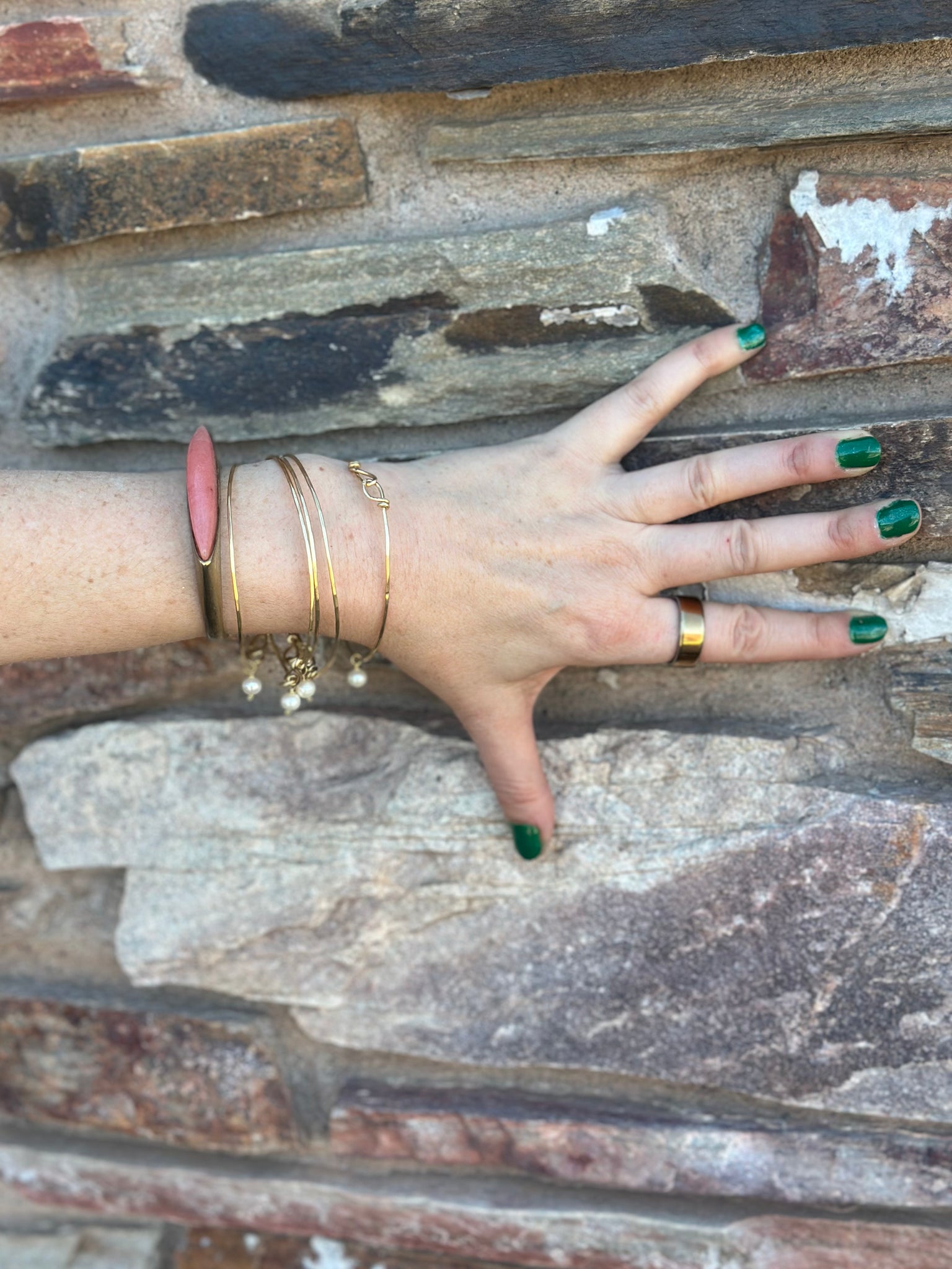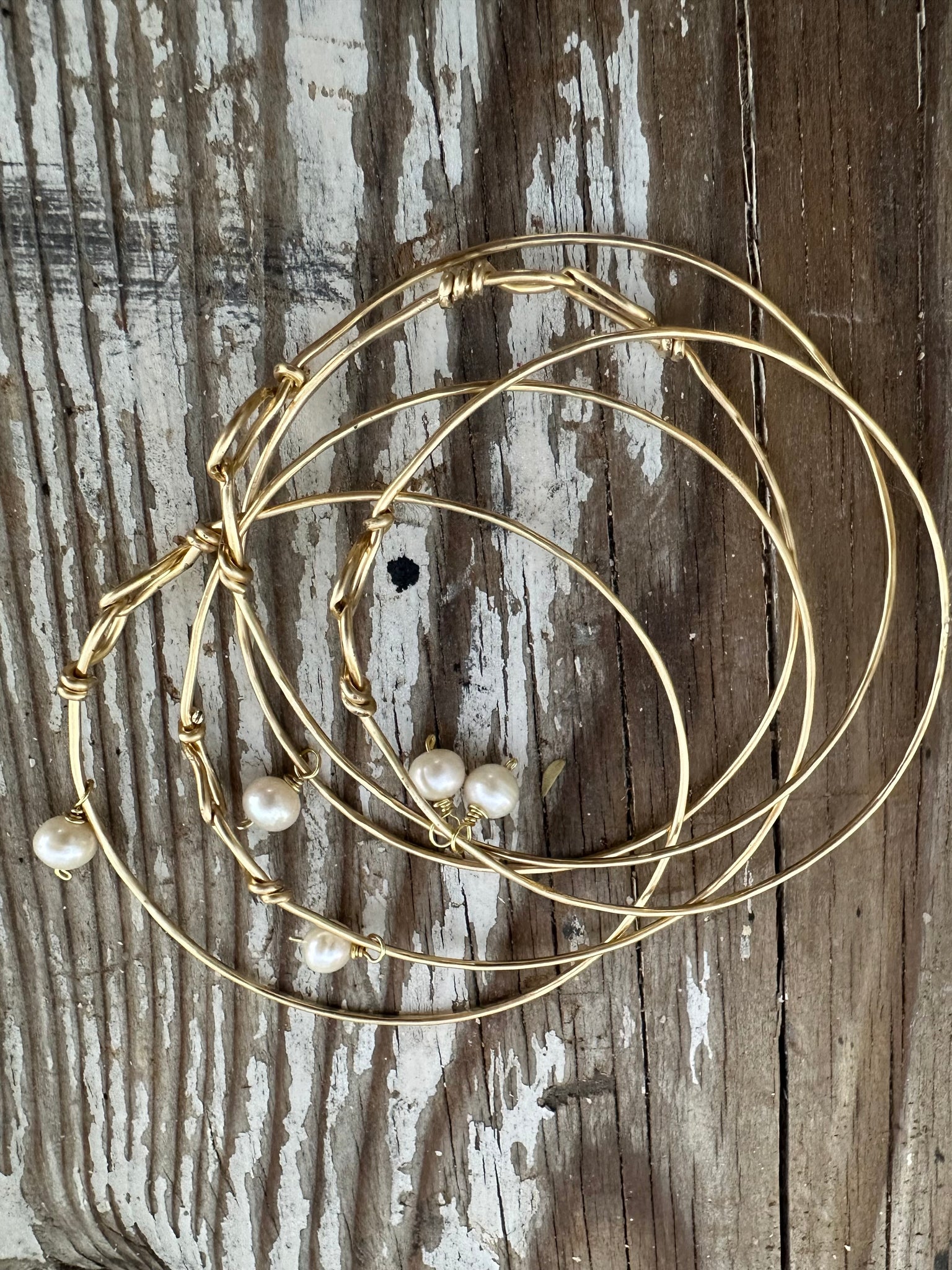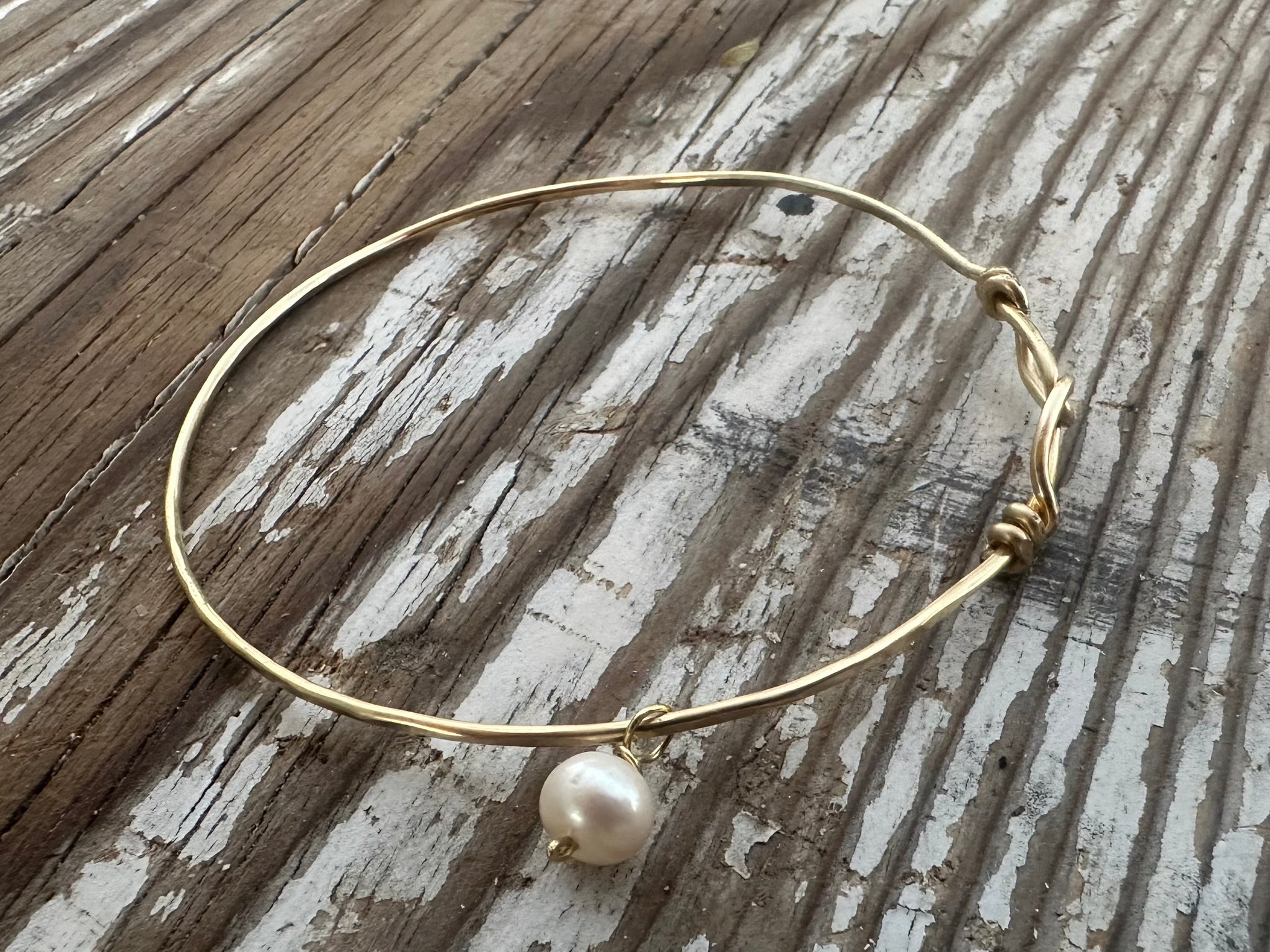 An 18 gauge hammered brass bangle with a freshwater free, floating pearl. In all sizes.