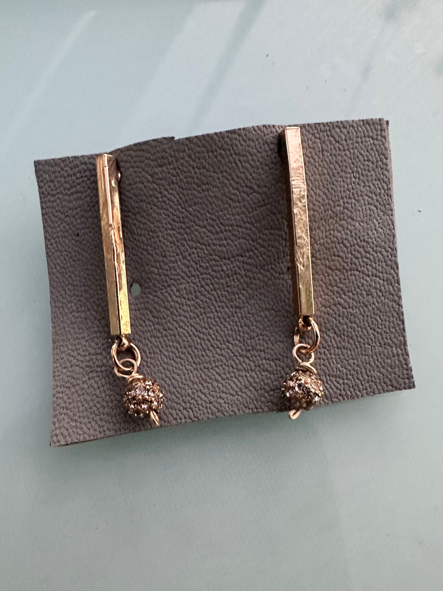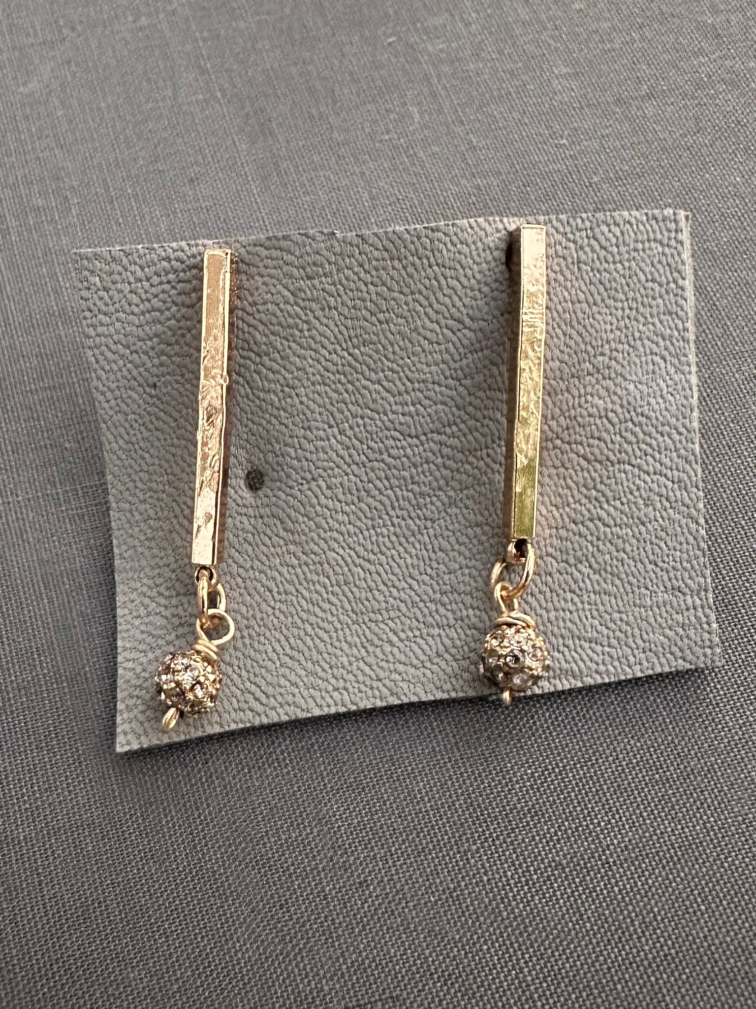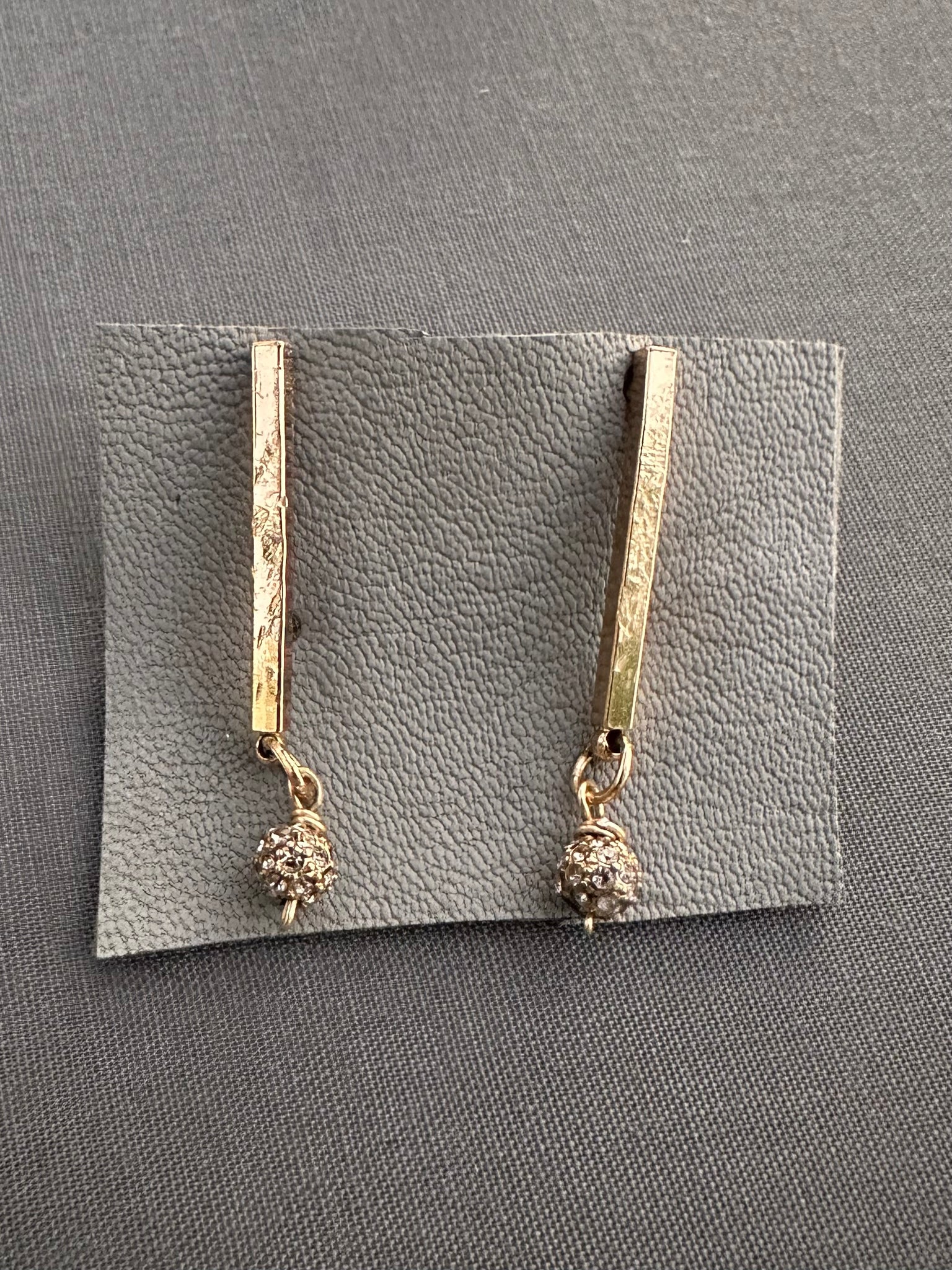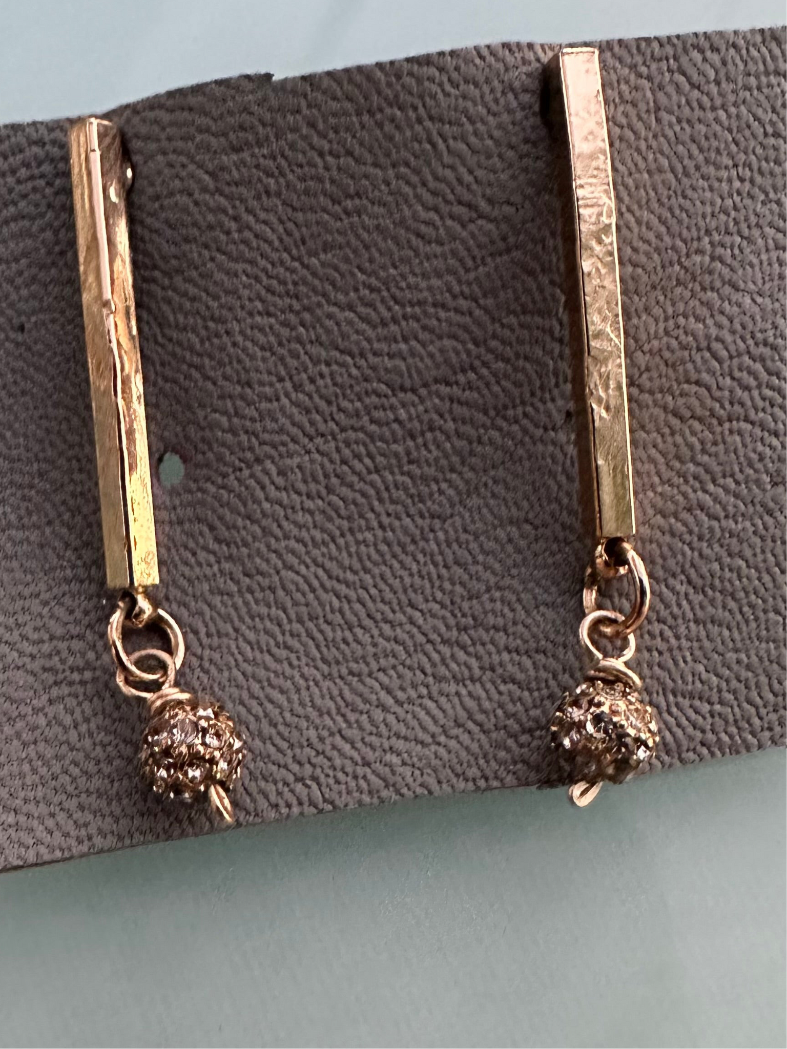 A post earring with a hammered gold bar and a vintage rhinestone encrusted gold filled sphere at the bottom.