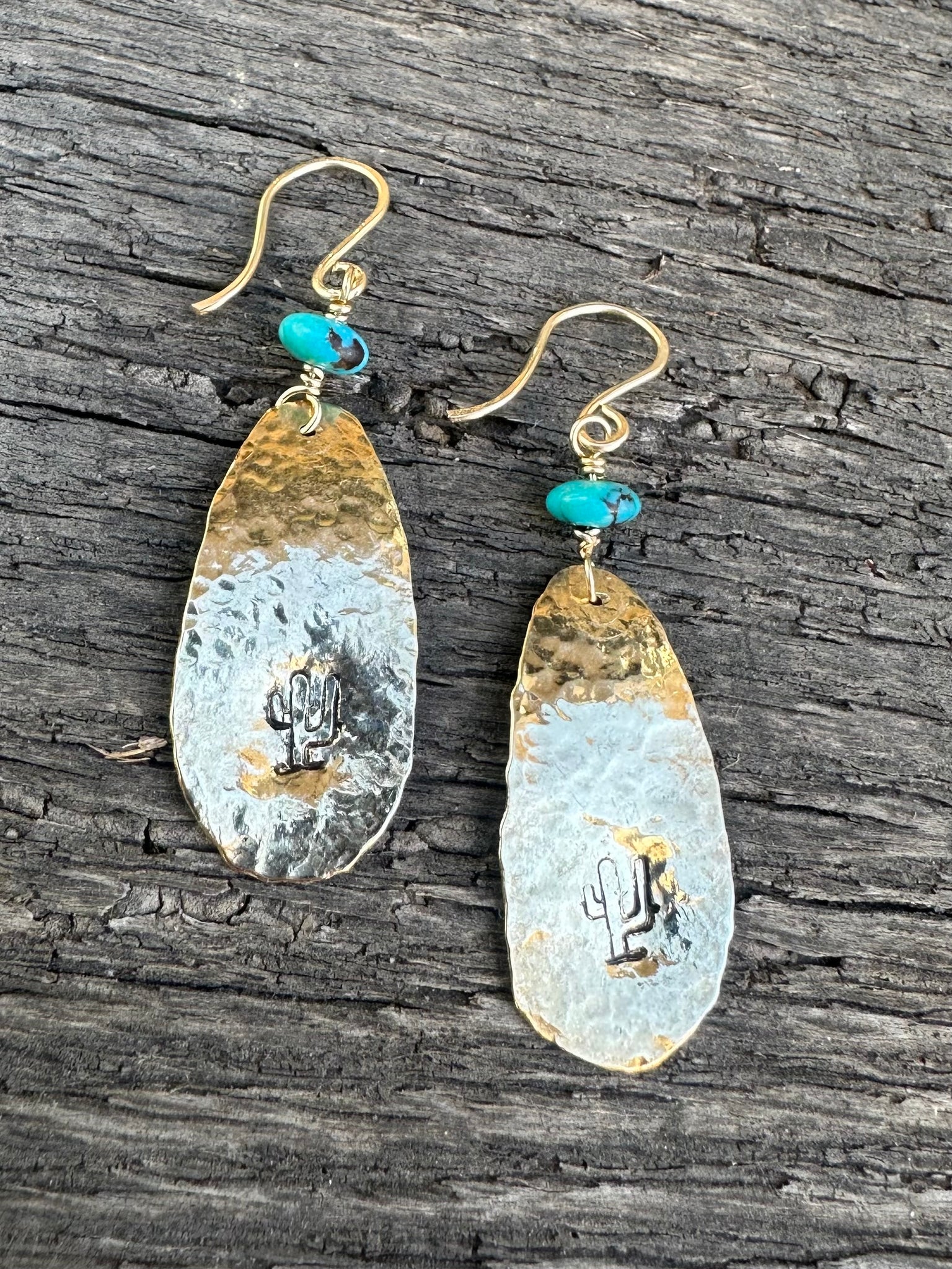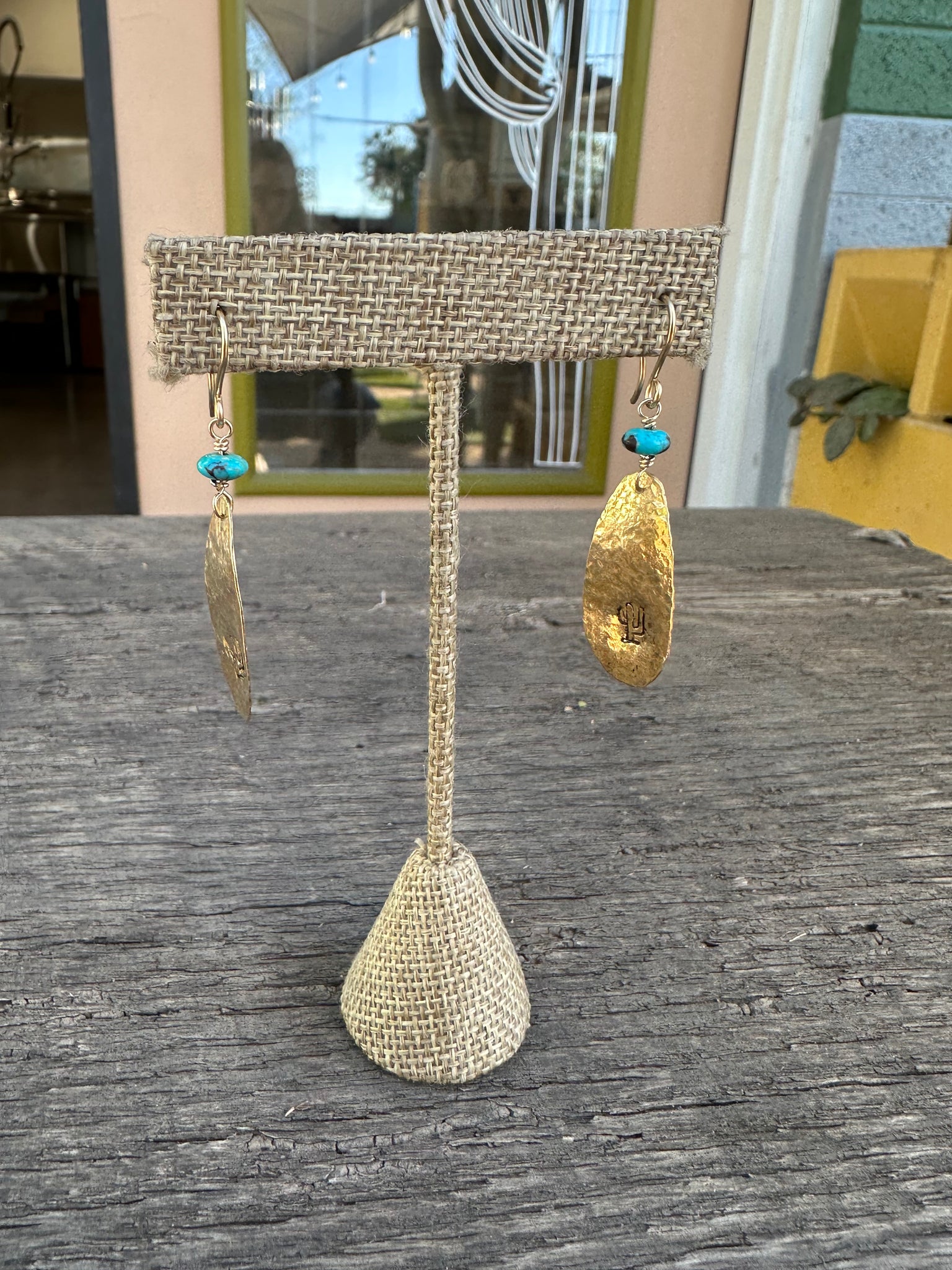 Hammered brass ovals With a saguaro stamp hanging from 14 K Goldfill hooks and a little slice of turquoise. 2 1/2 inches long