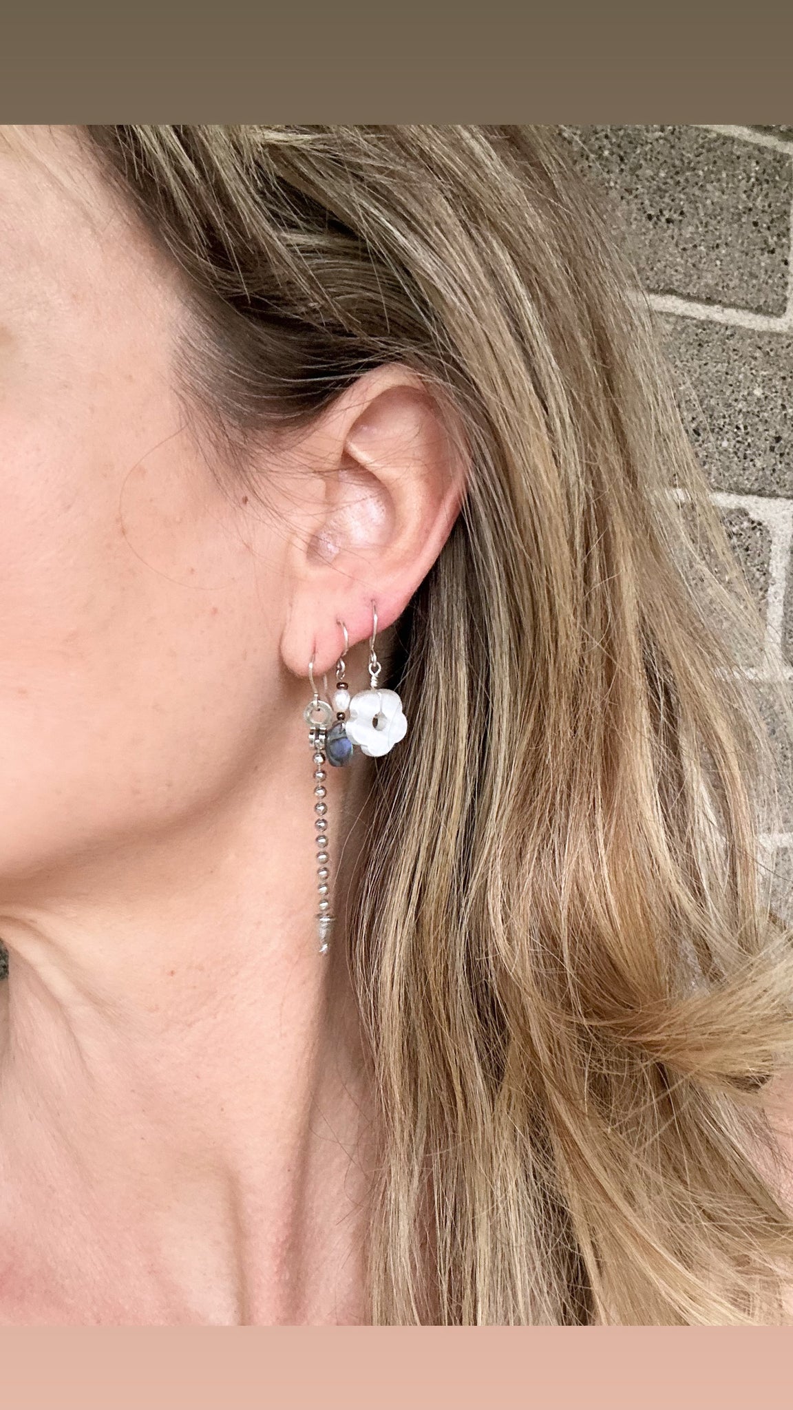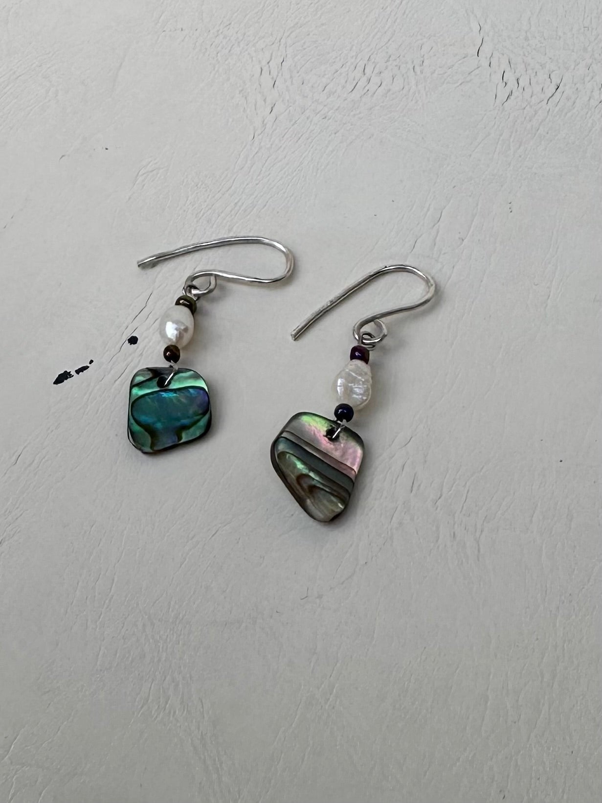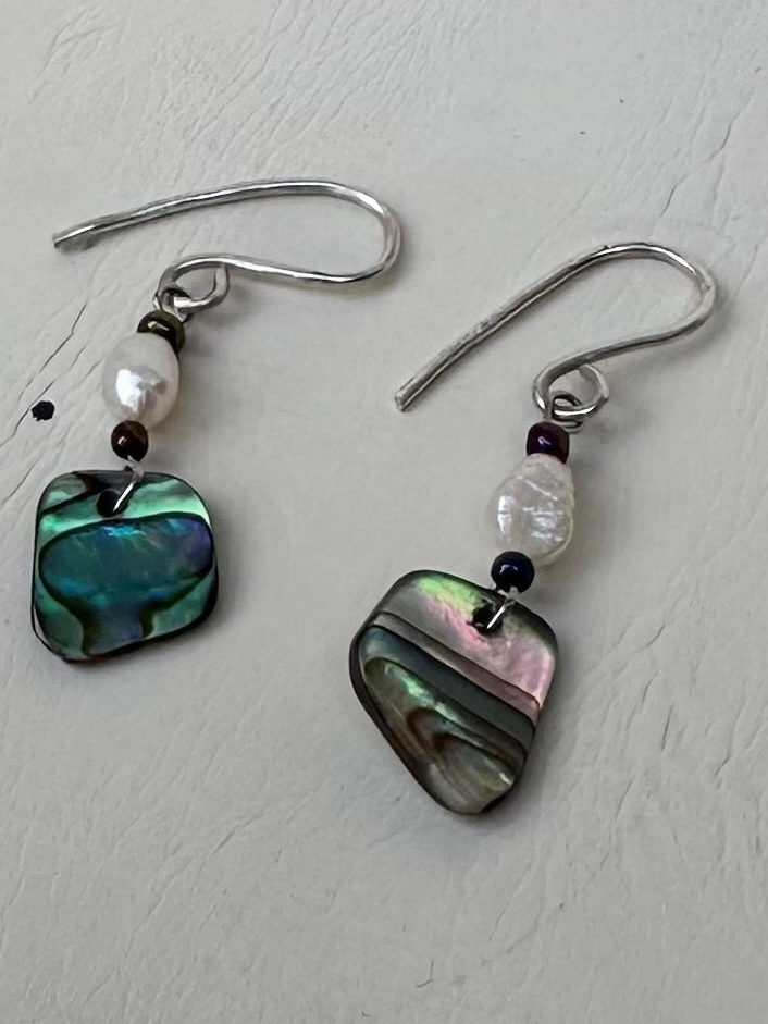 Sterling, silver hooks, freshwater pearls and a little piece of abalone. One and a half inches long.