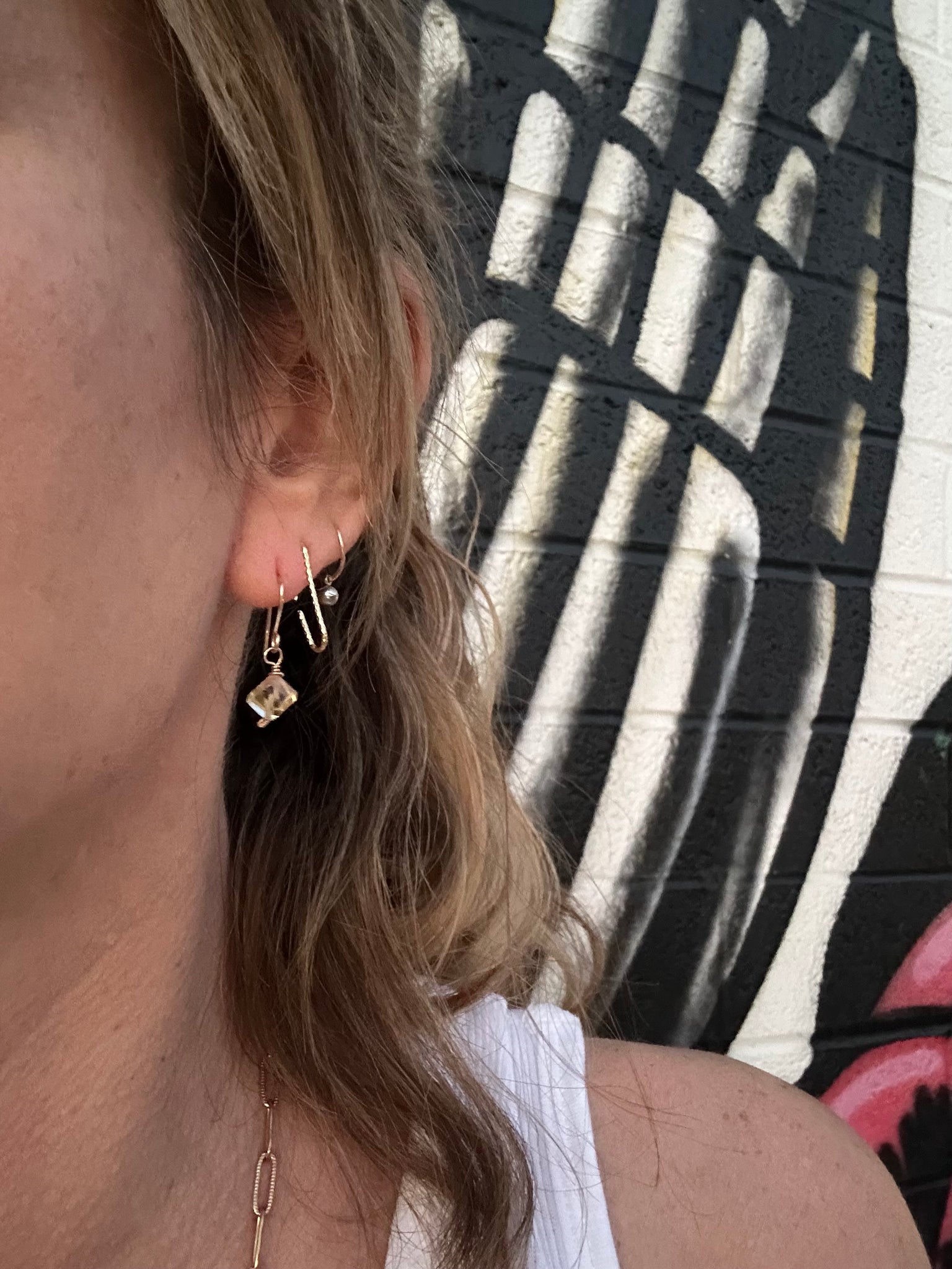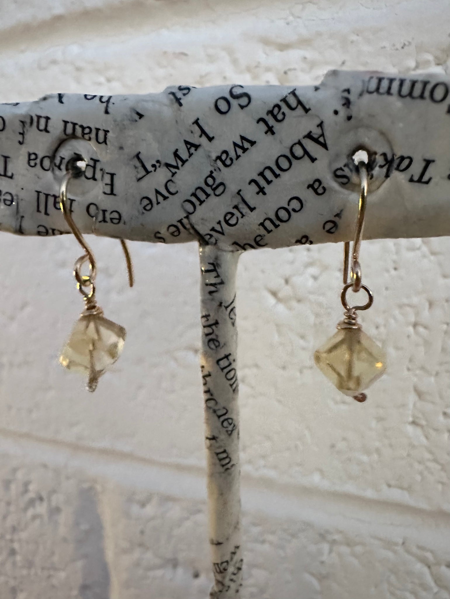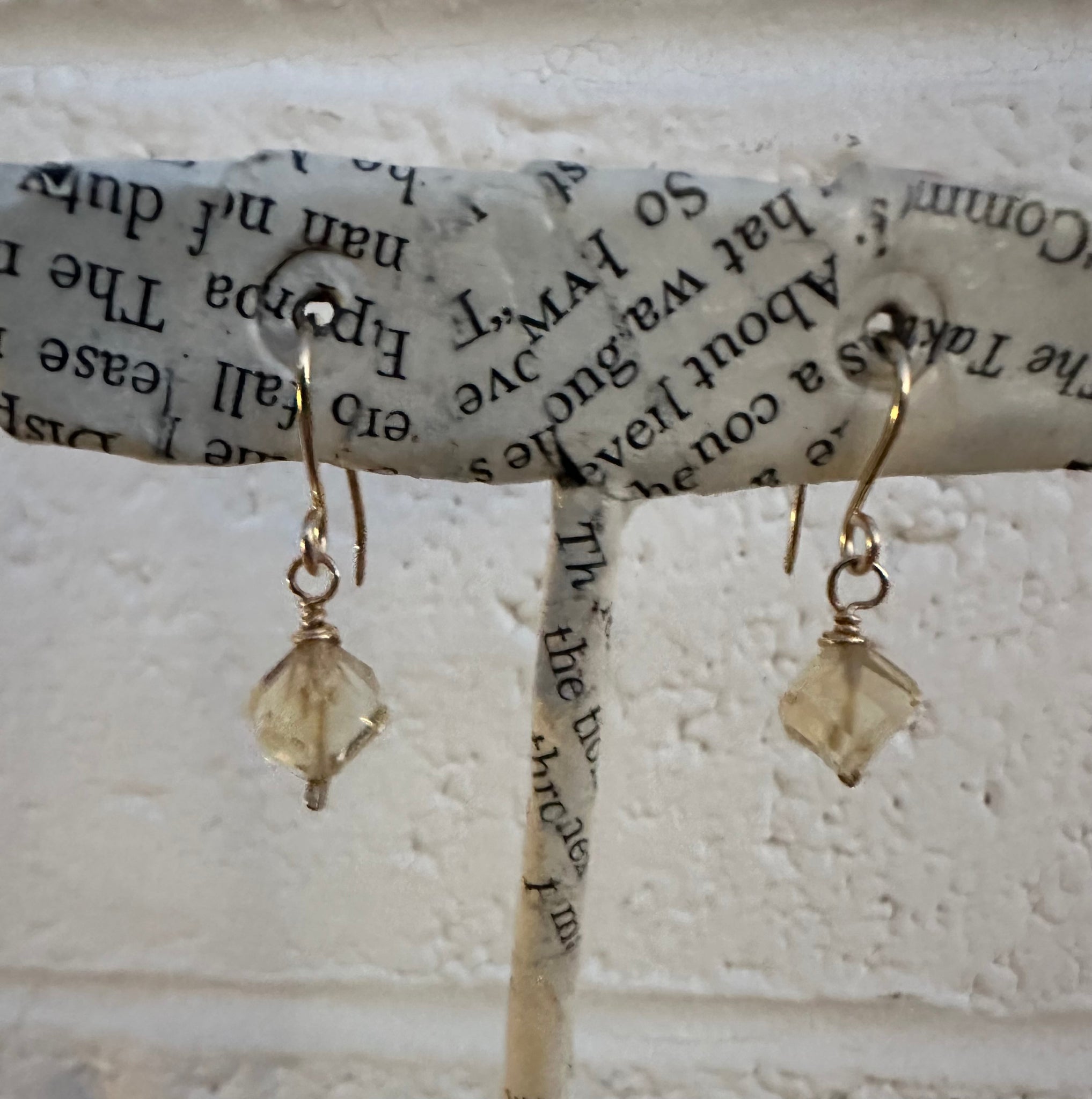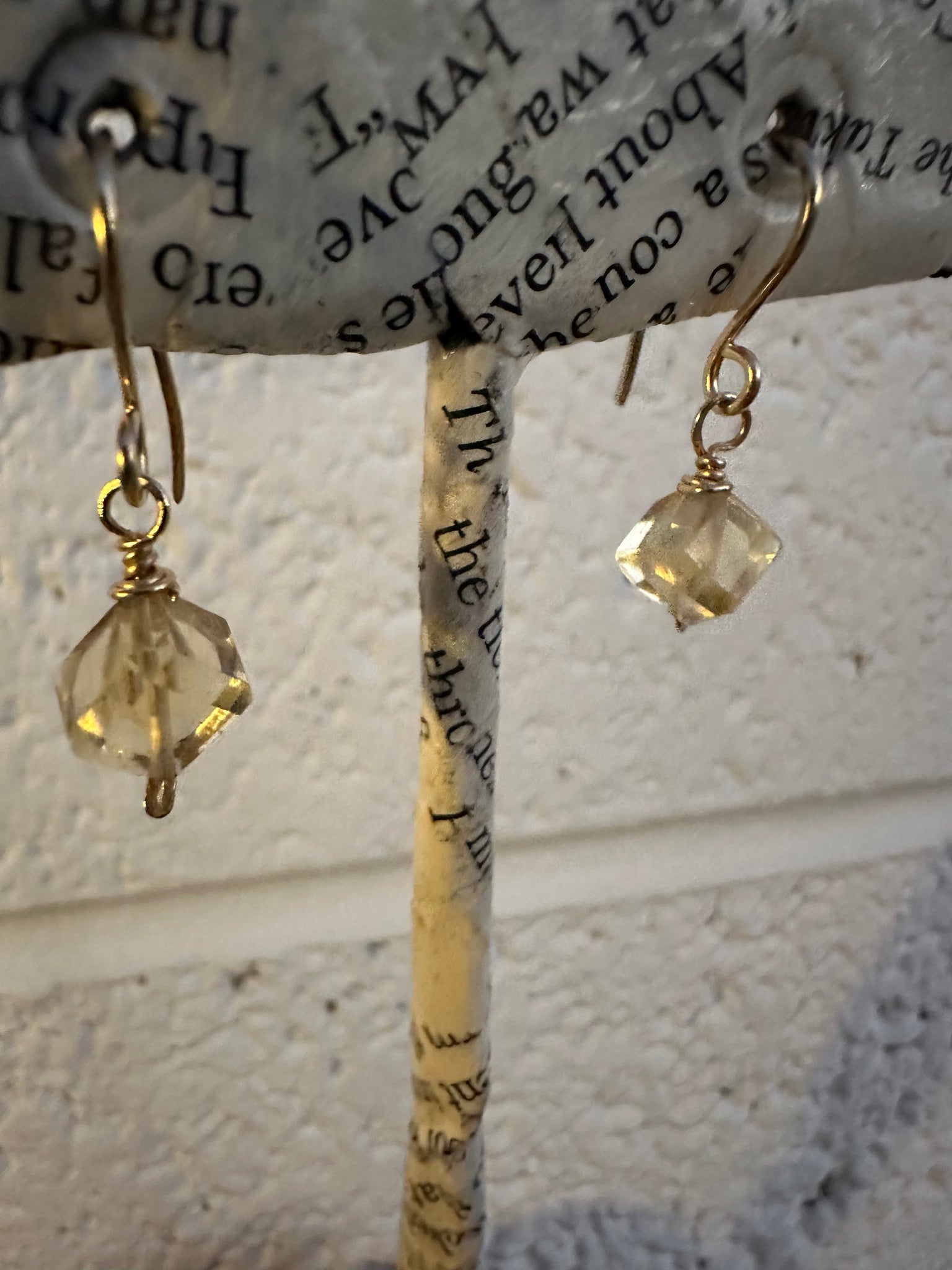 Hand cut Faceted citrine cubes hanging below a 14 k goldfill hook