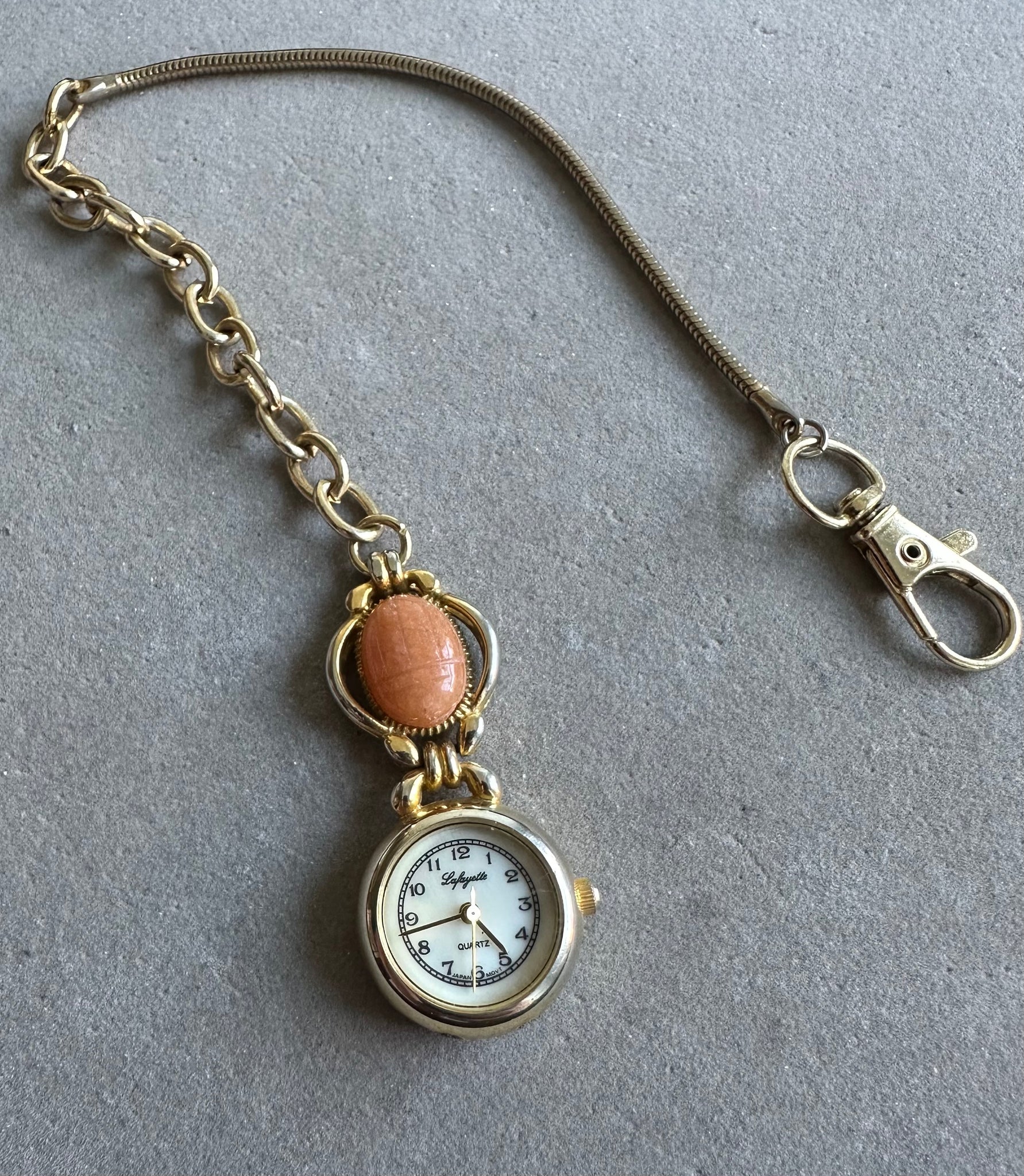 Lafayette watch face with original carved scarab bug stone and 23 K gold plate. Added chain to make it into a pocket watch with a hook on the end! New battery – works great.