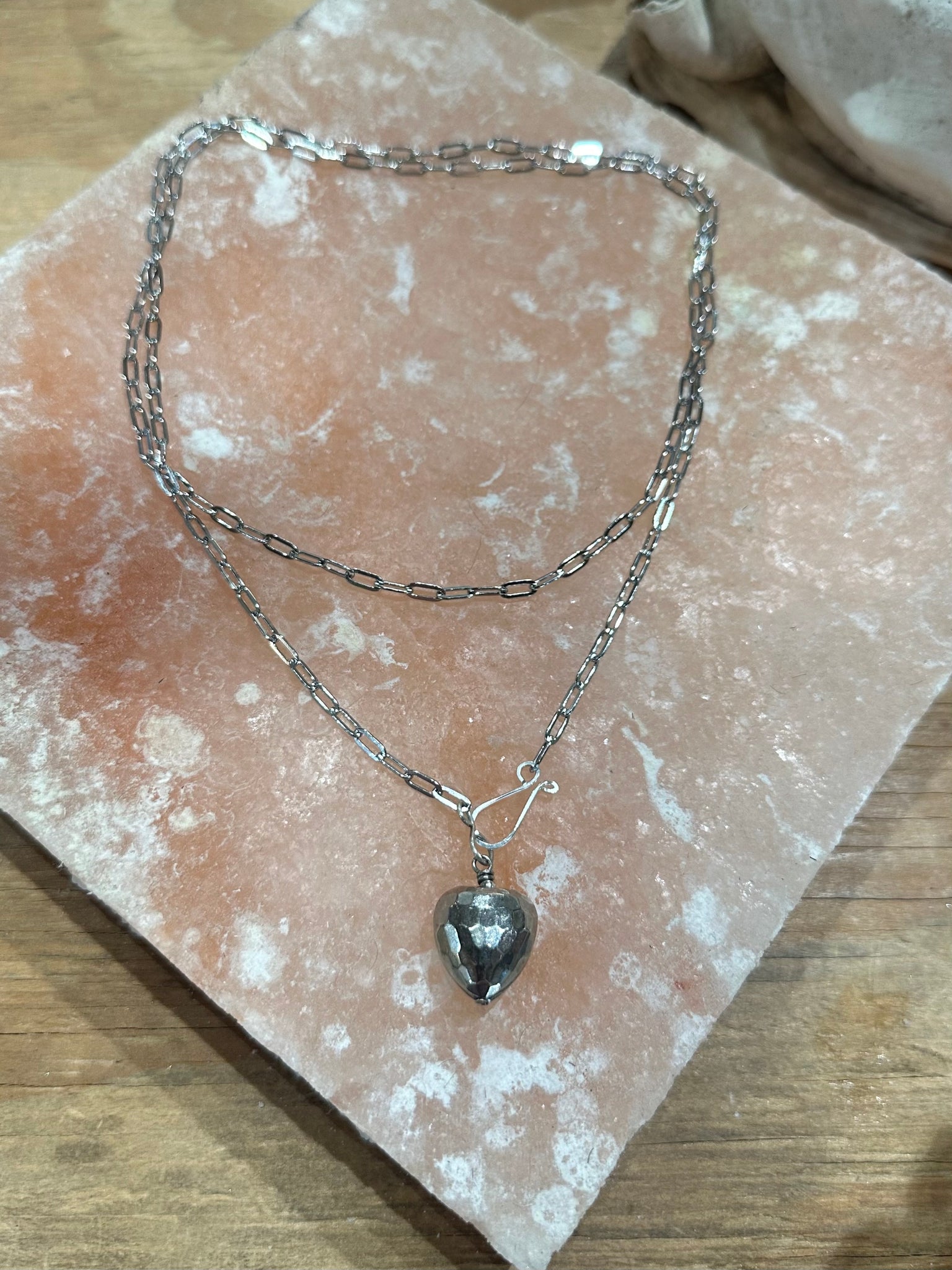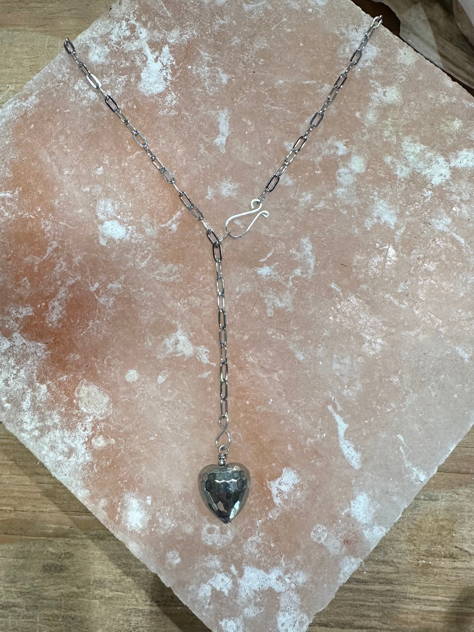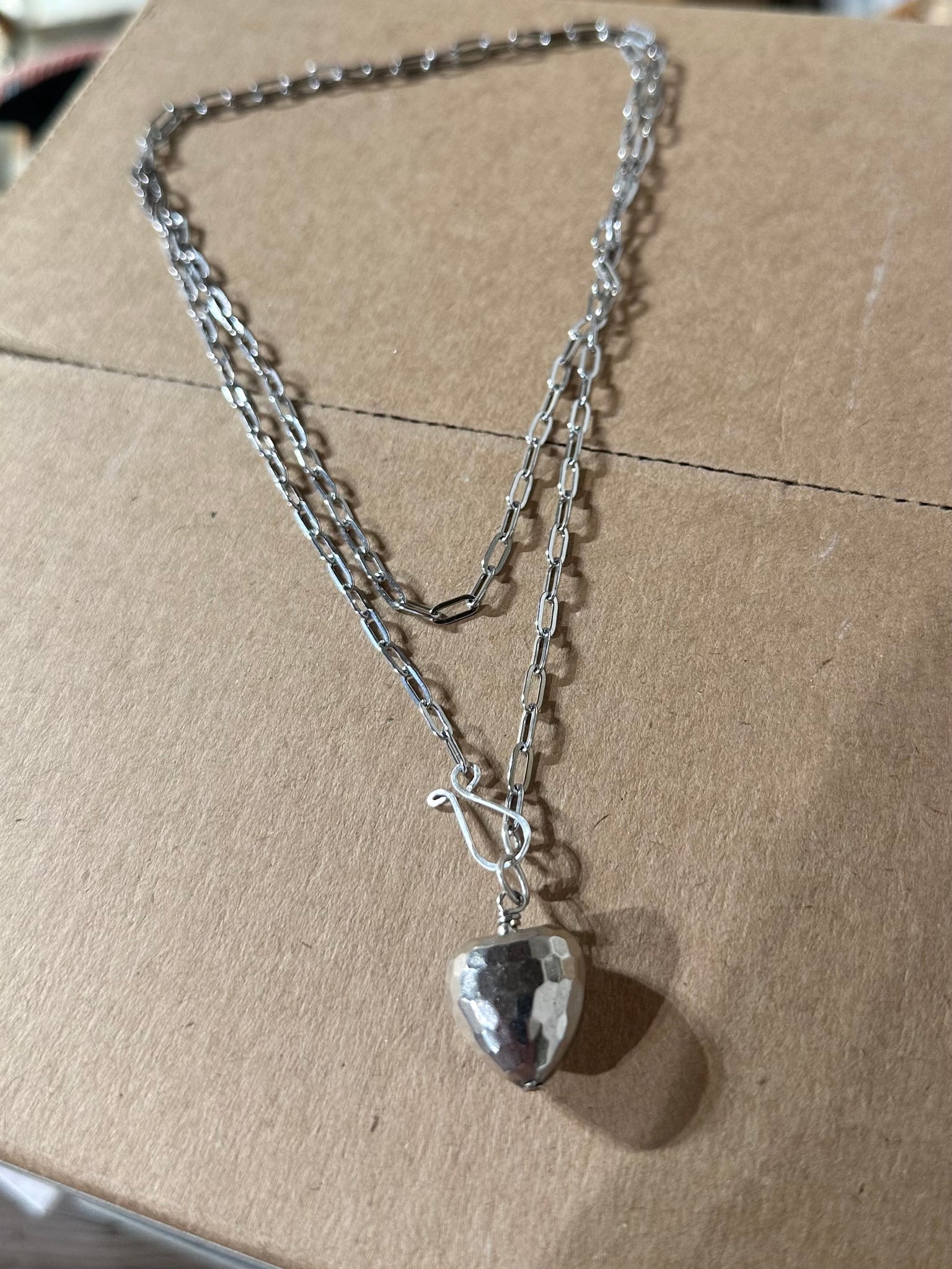 Long 33 inch stainless steel paperclip chain with faceted disco puffy heart.