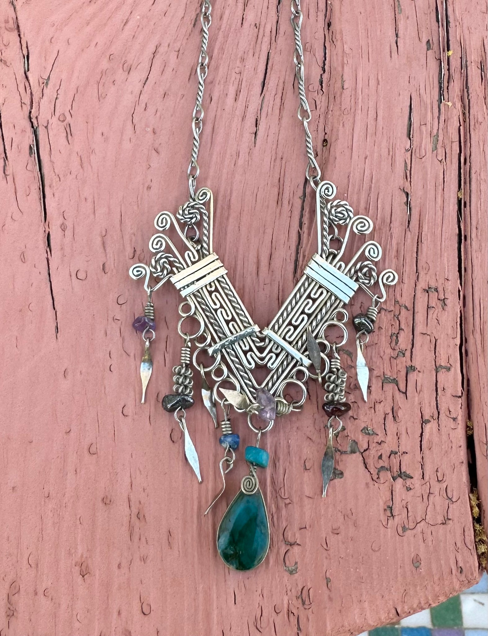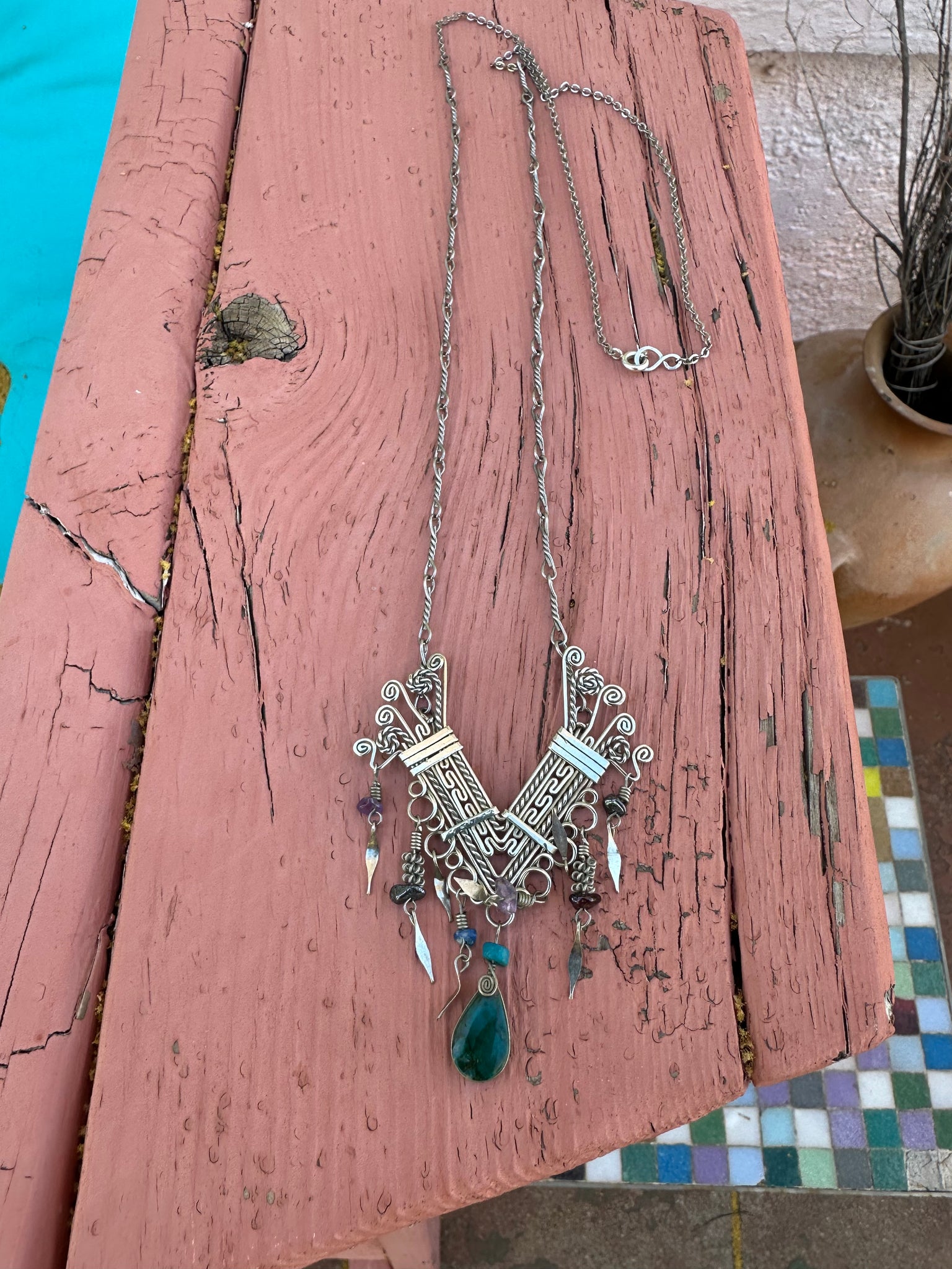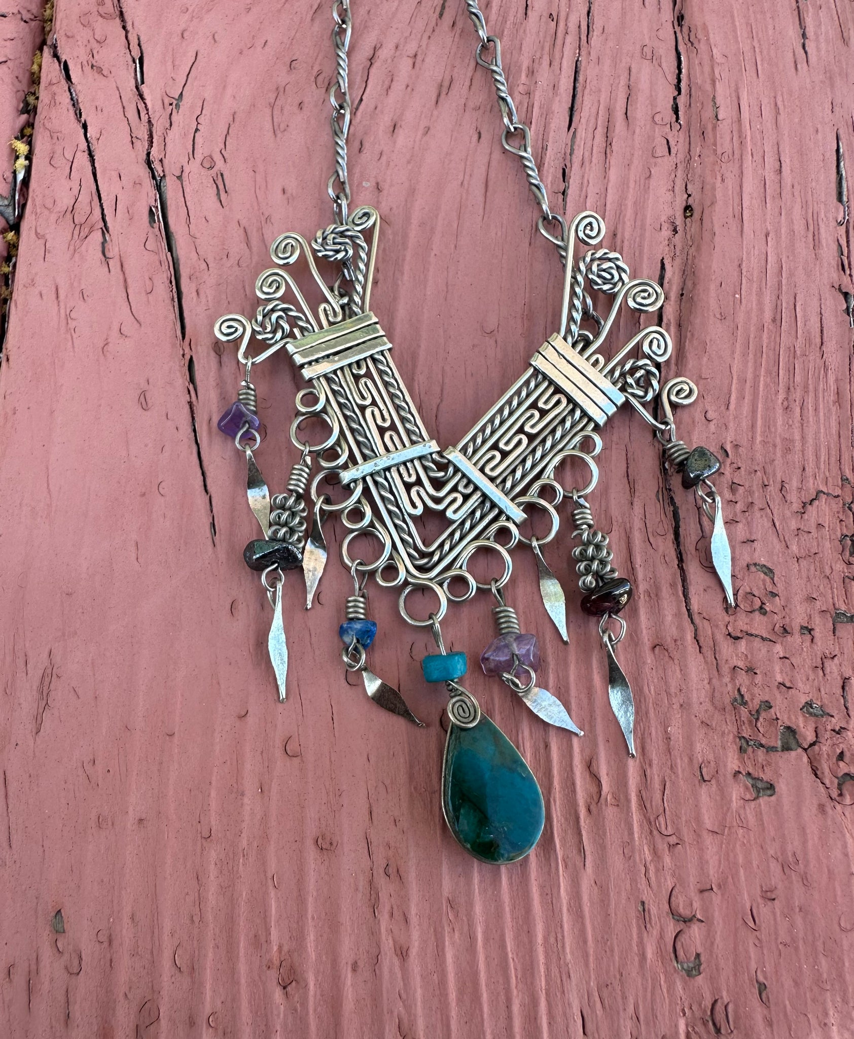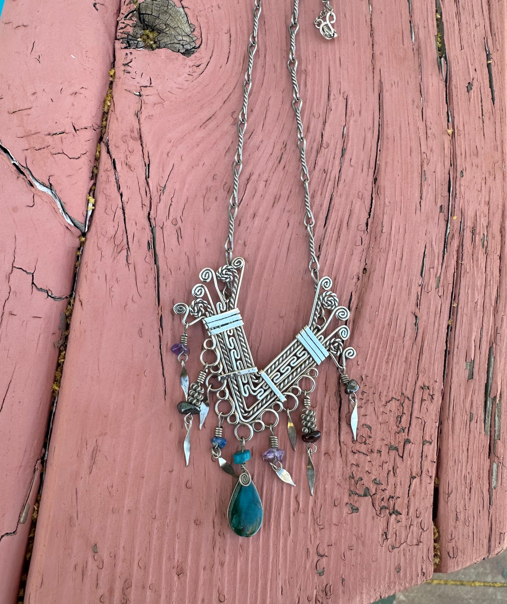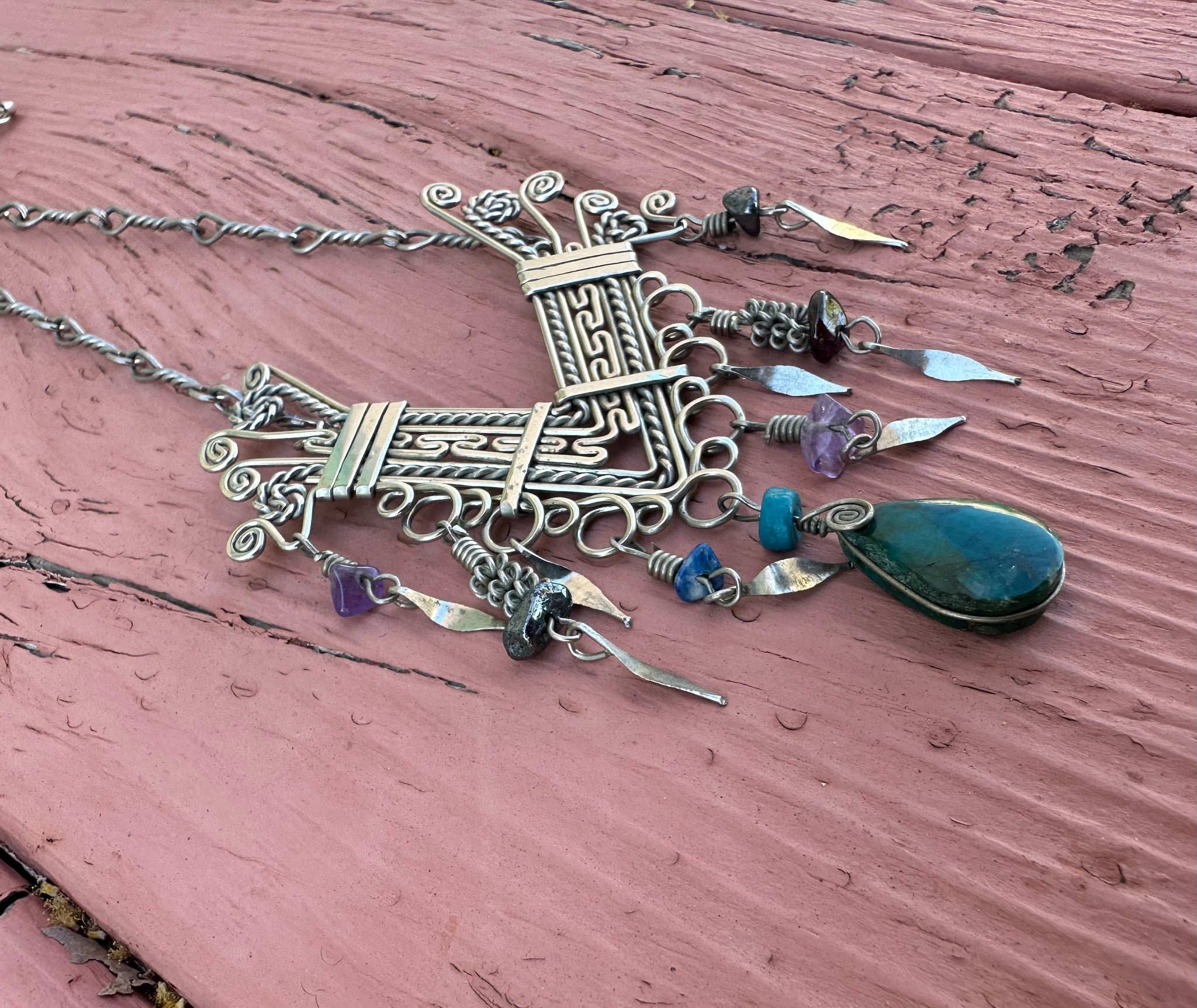 Stunning Peruvian handmade sterling piece I fashioned into a pendant and added a long silver chain. This is a real show stopper- there’s only one like it!
