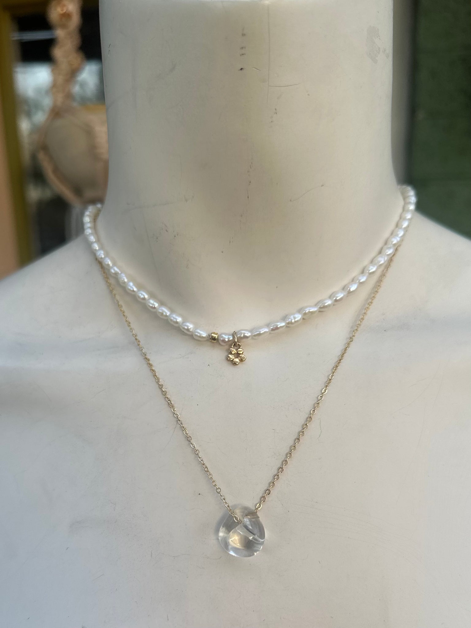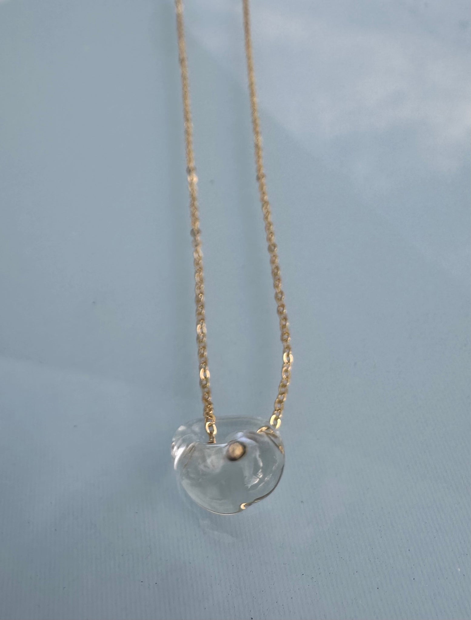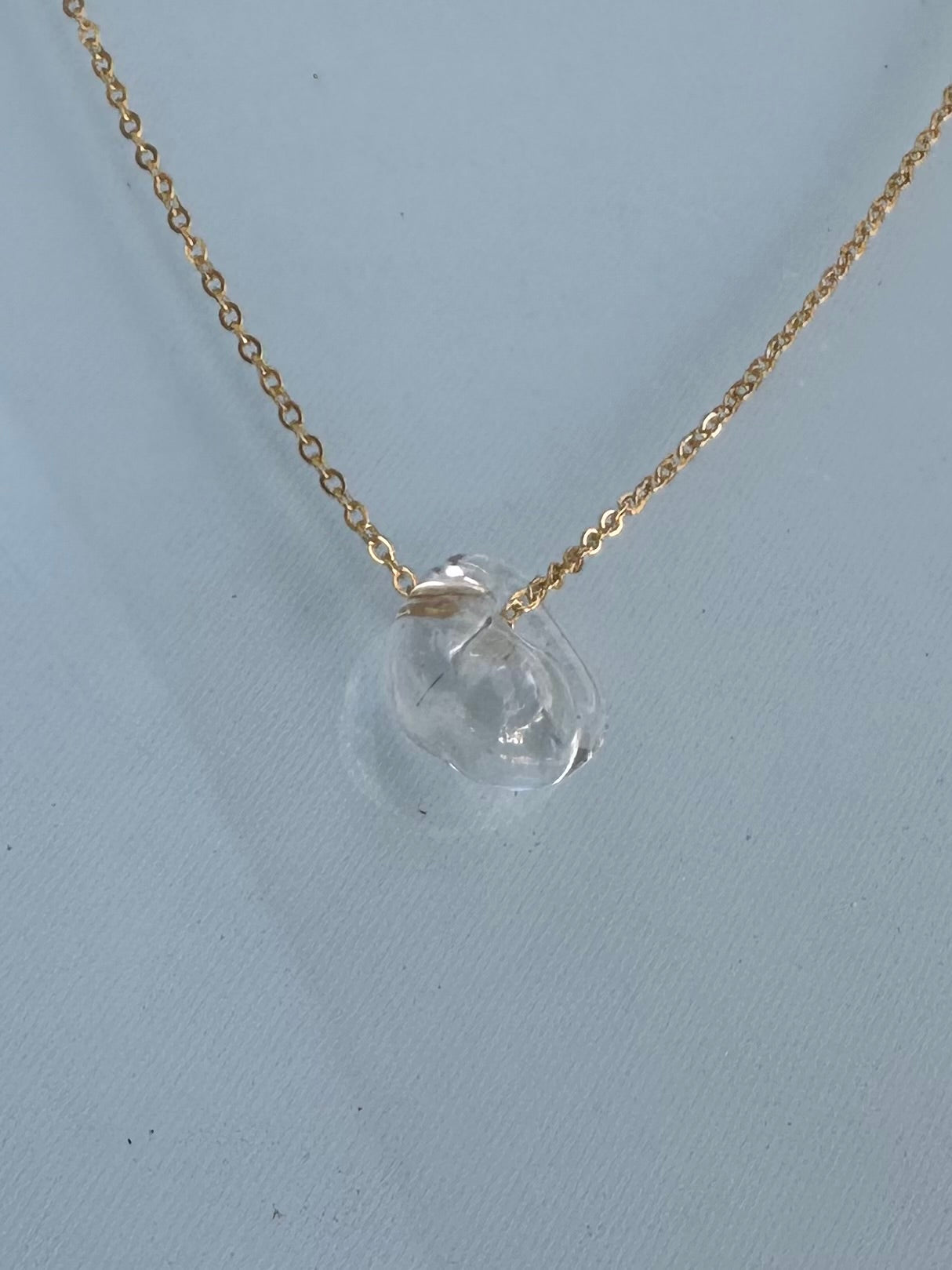 18 inch gold plated chain with a free form glass pendant that slides freely on the chain.