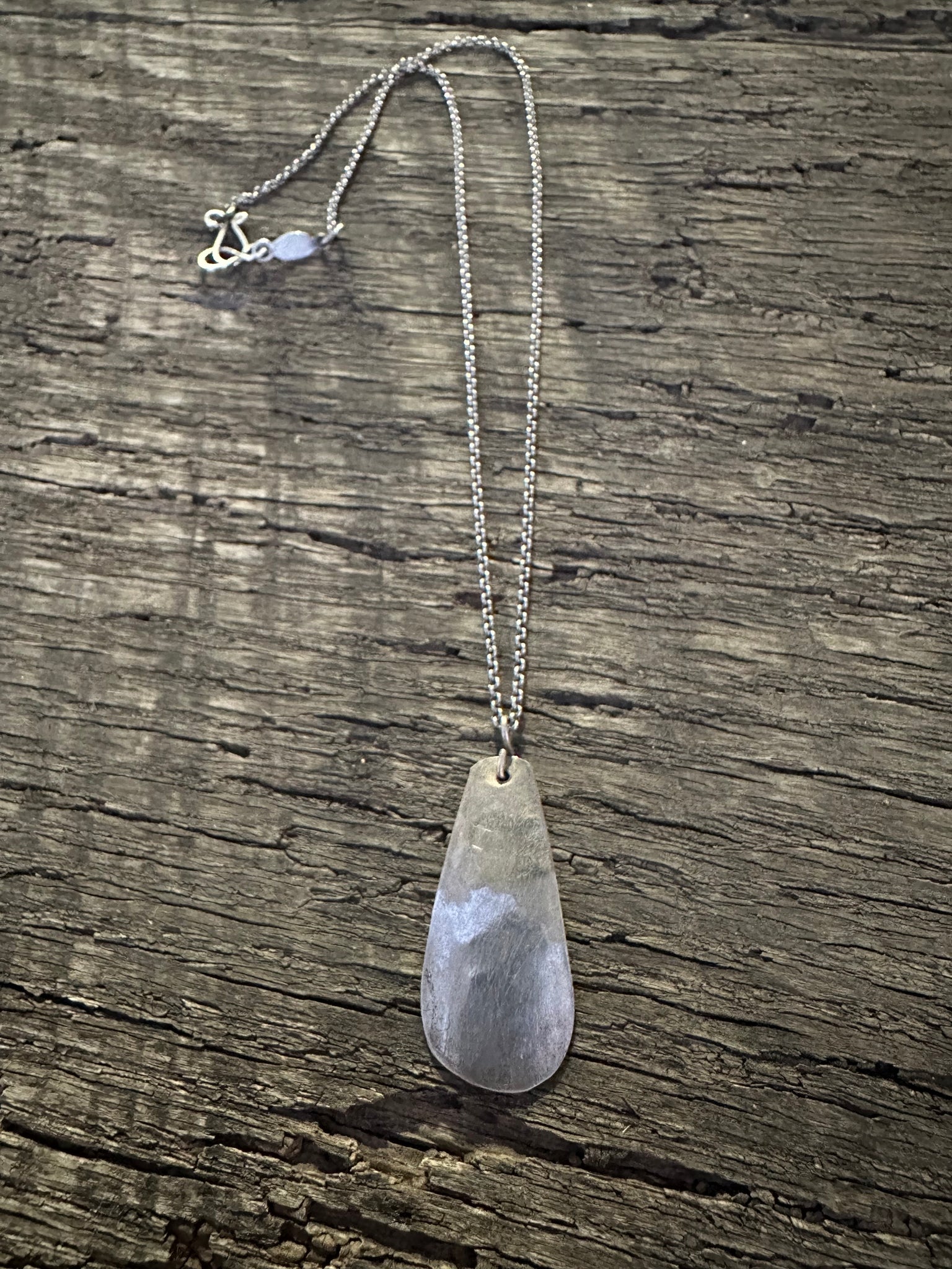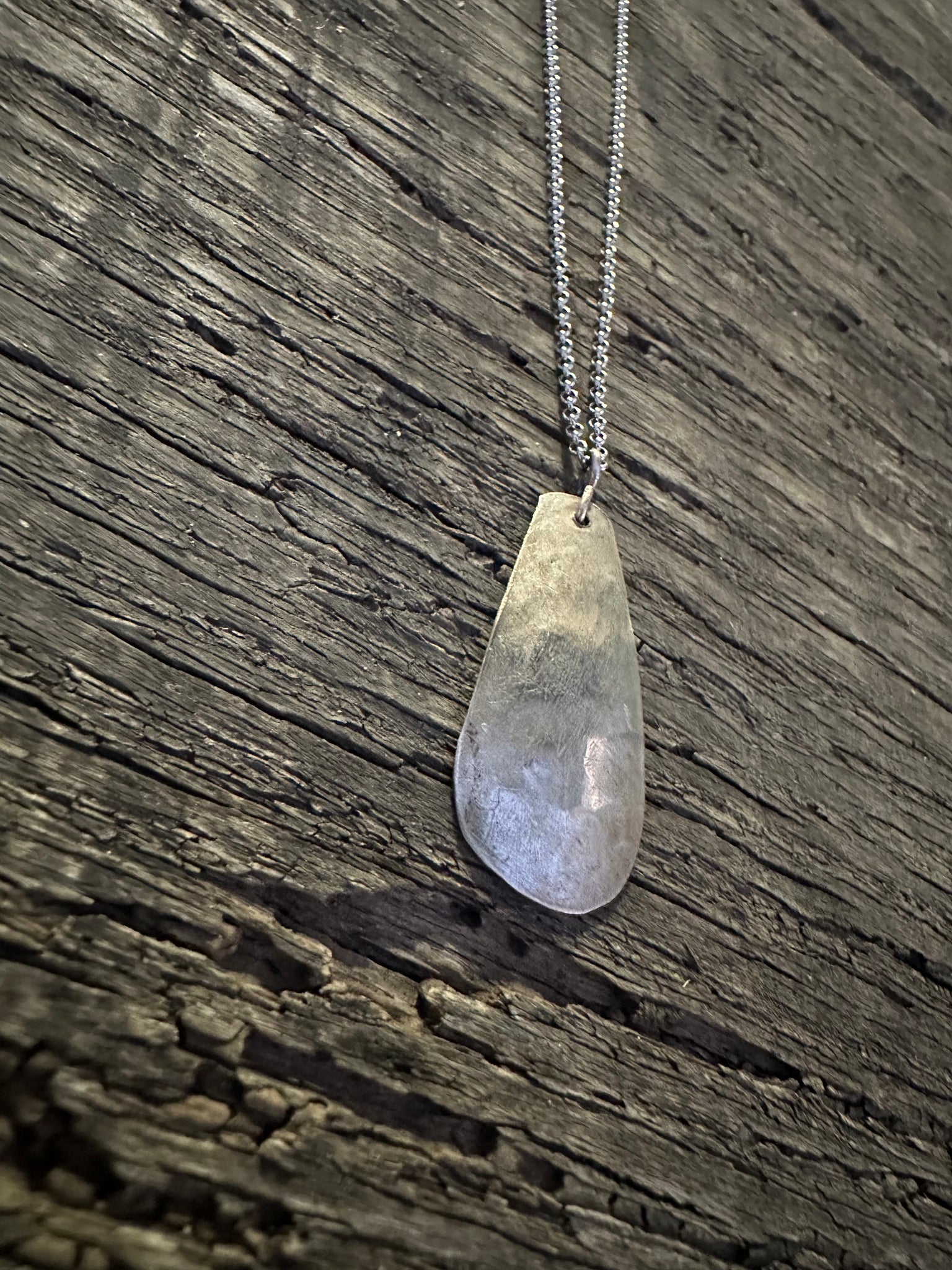Recycled sterling teardrop hanging from a silver chain. 18 inches long.