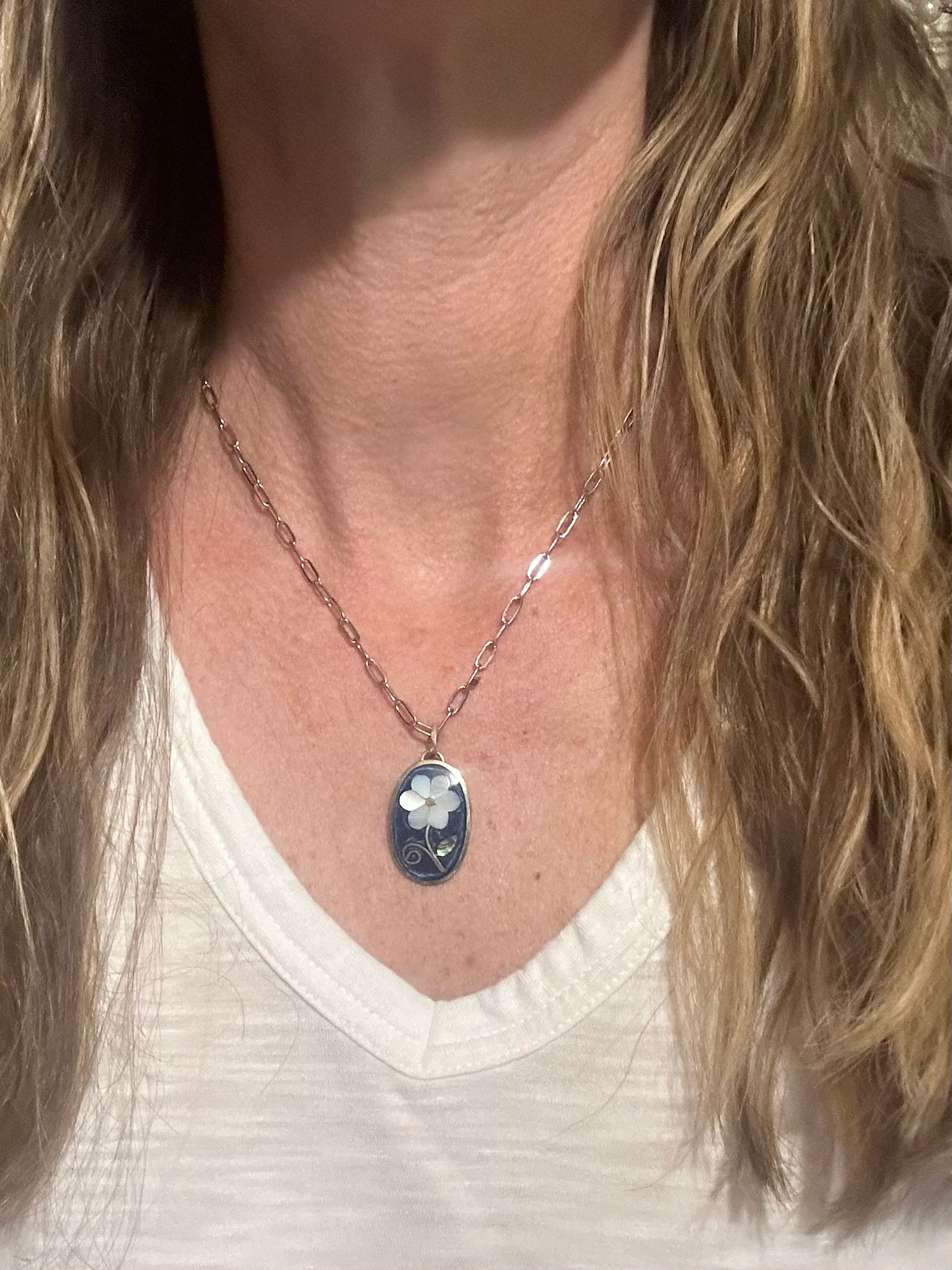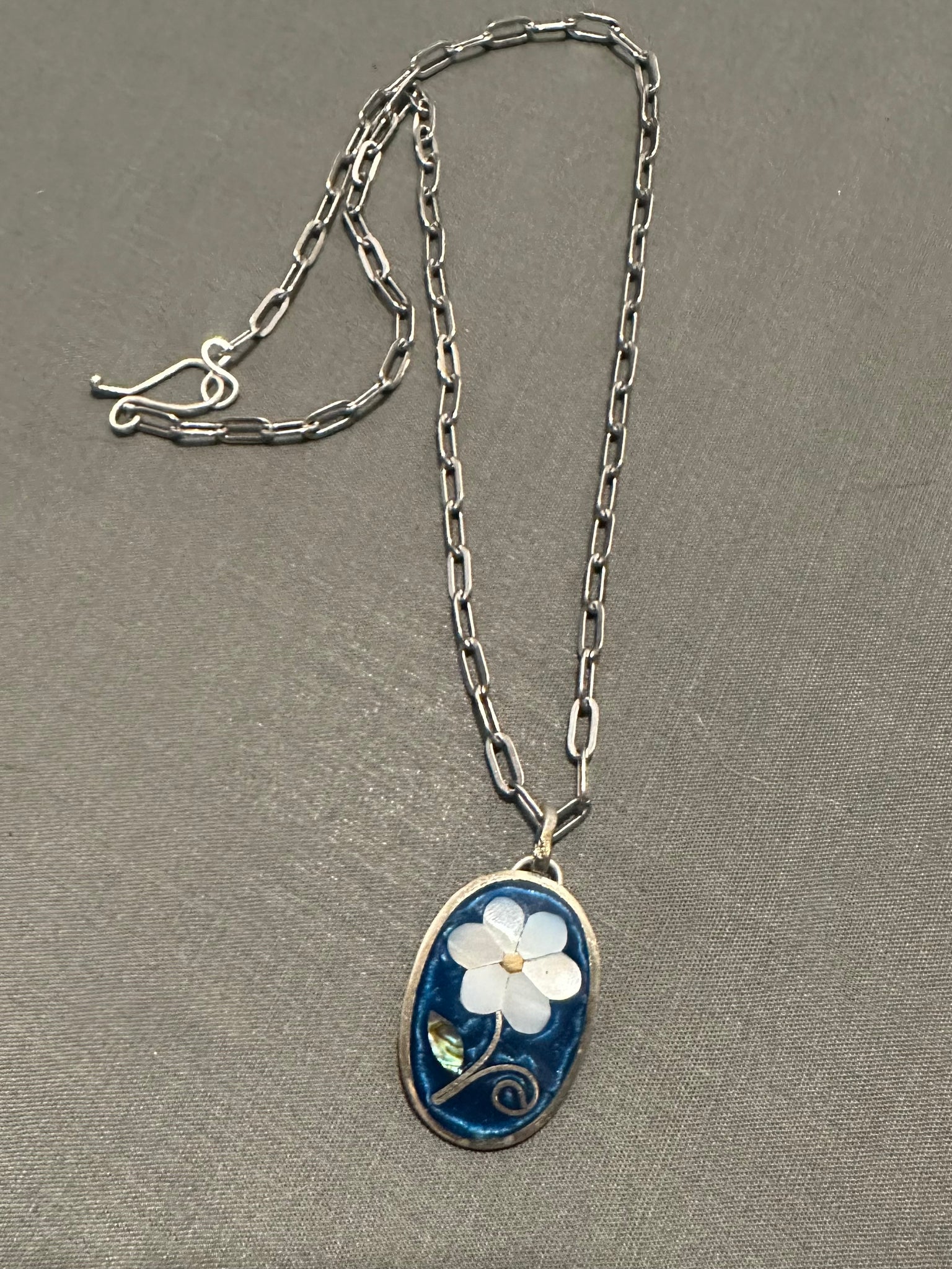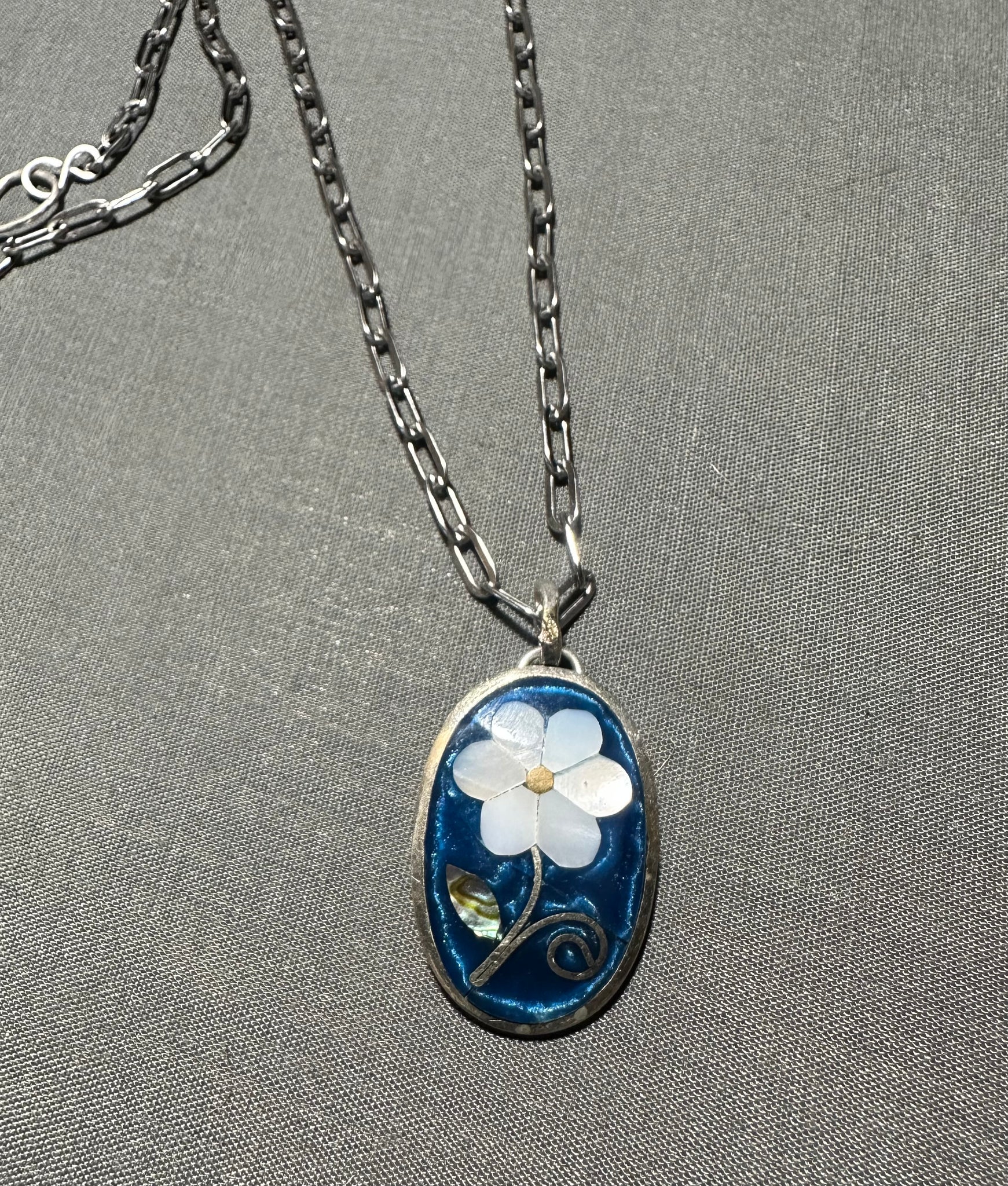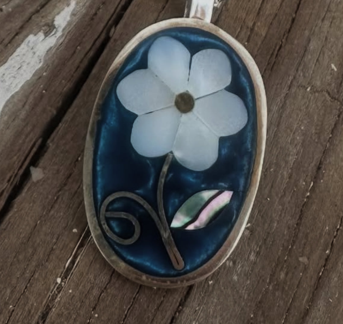 This vintage Mexican Alpaca silver mother of pearl and abalone inlay floral piece has been upcycled and given new life! It’s on a stainless steel paperclip chain that can be worn 18 inches or adjusted to be worn shorter.