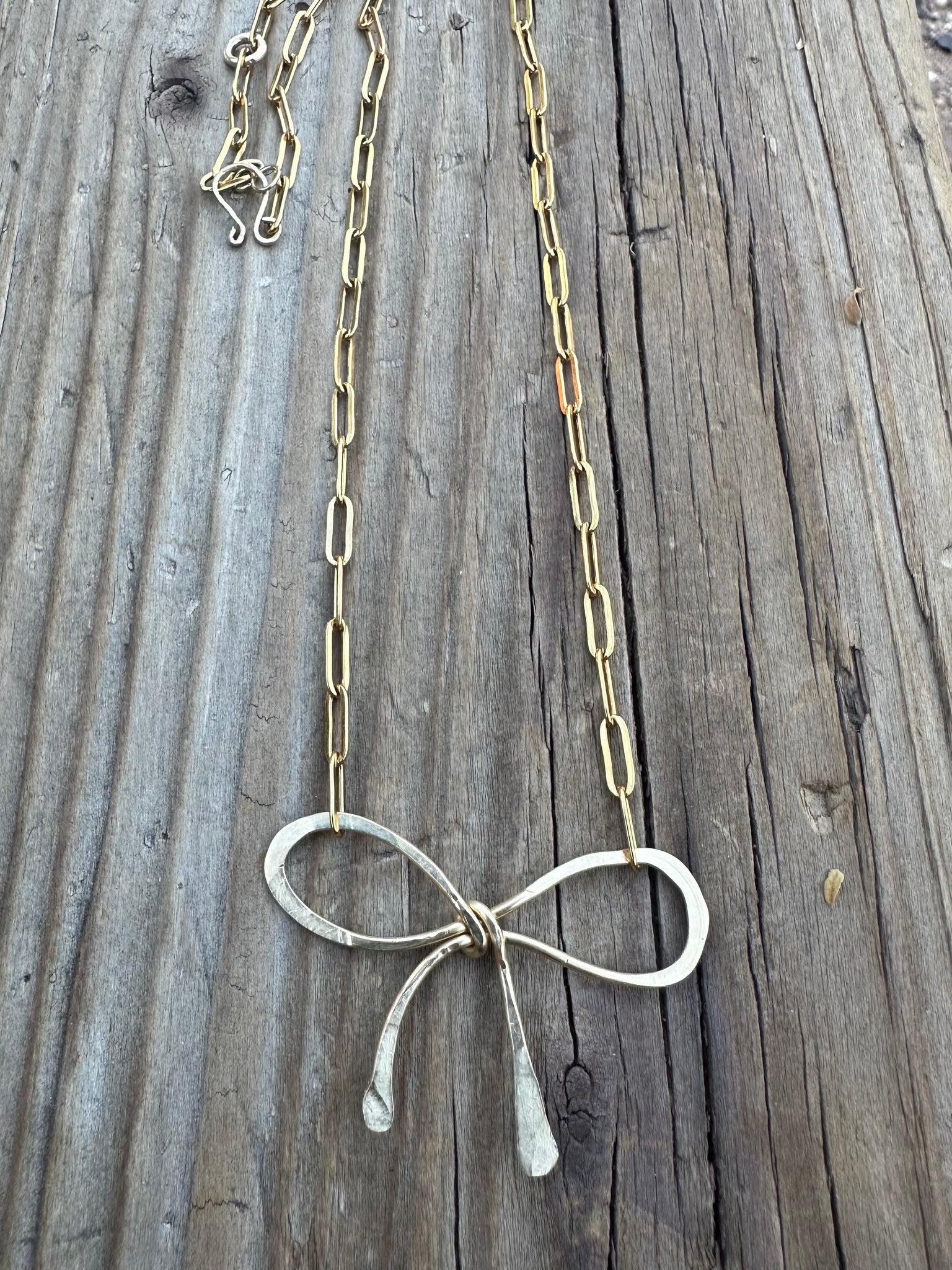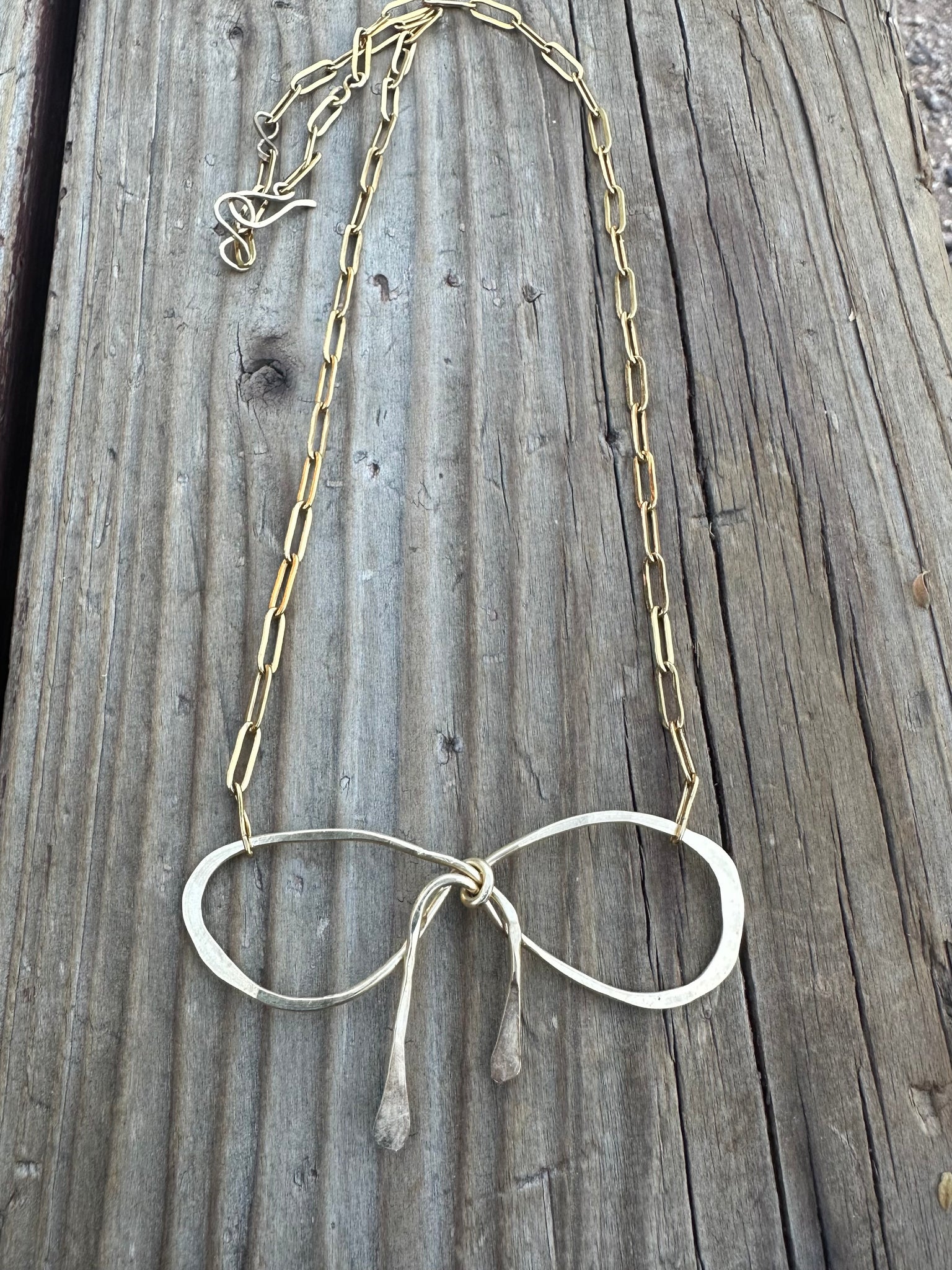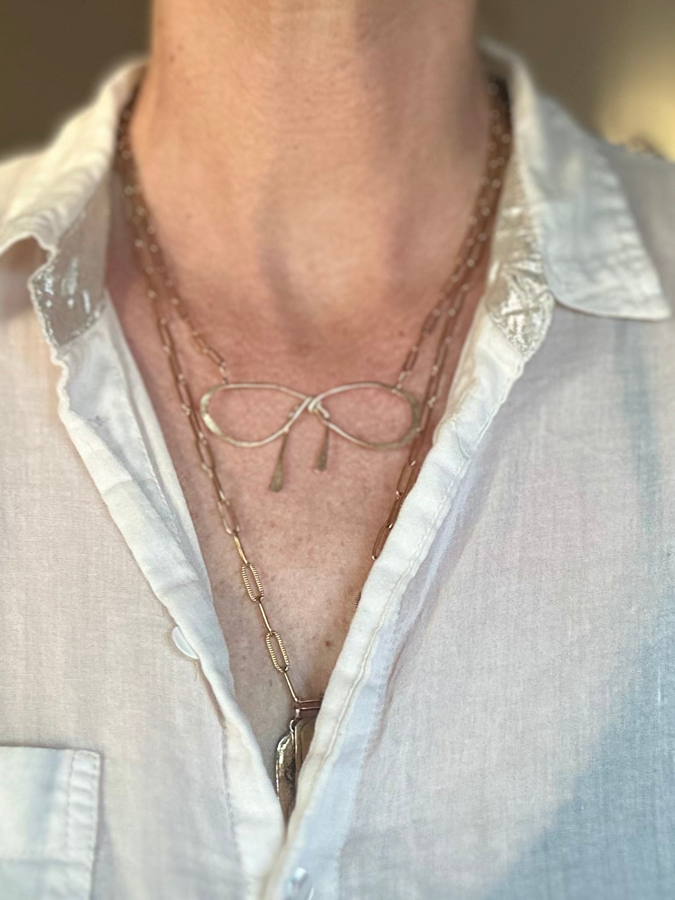 Hand formed and hammered brass wire on a gold plated paperclip chain. Necklace length is 18 inches.