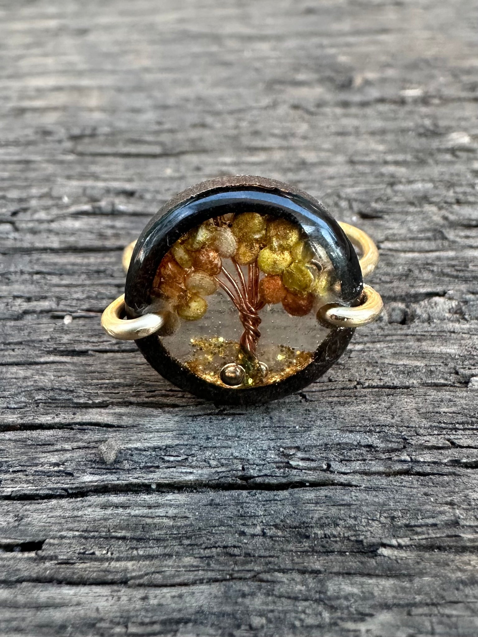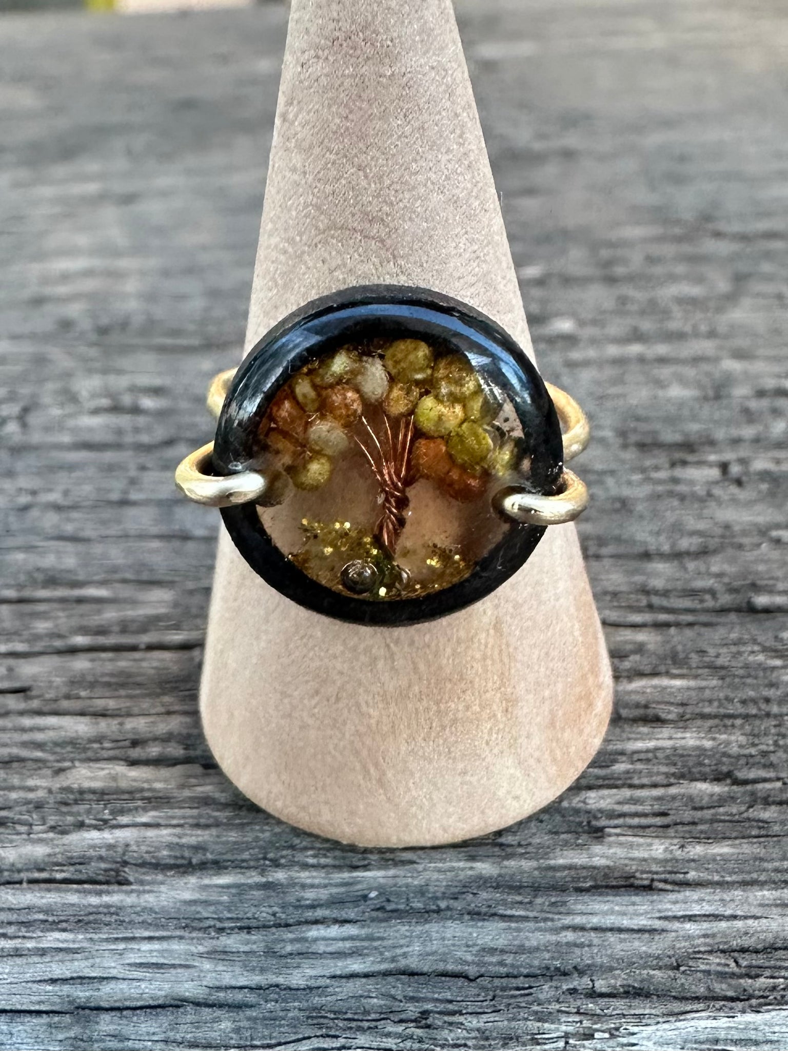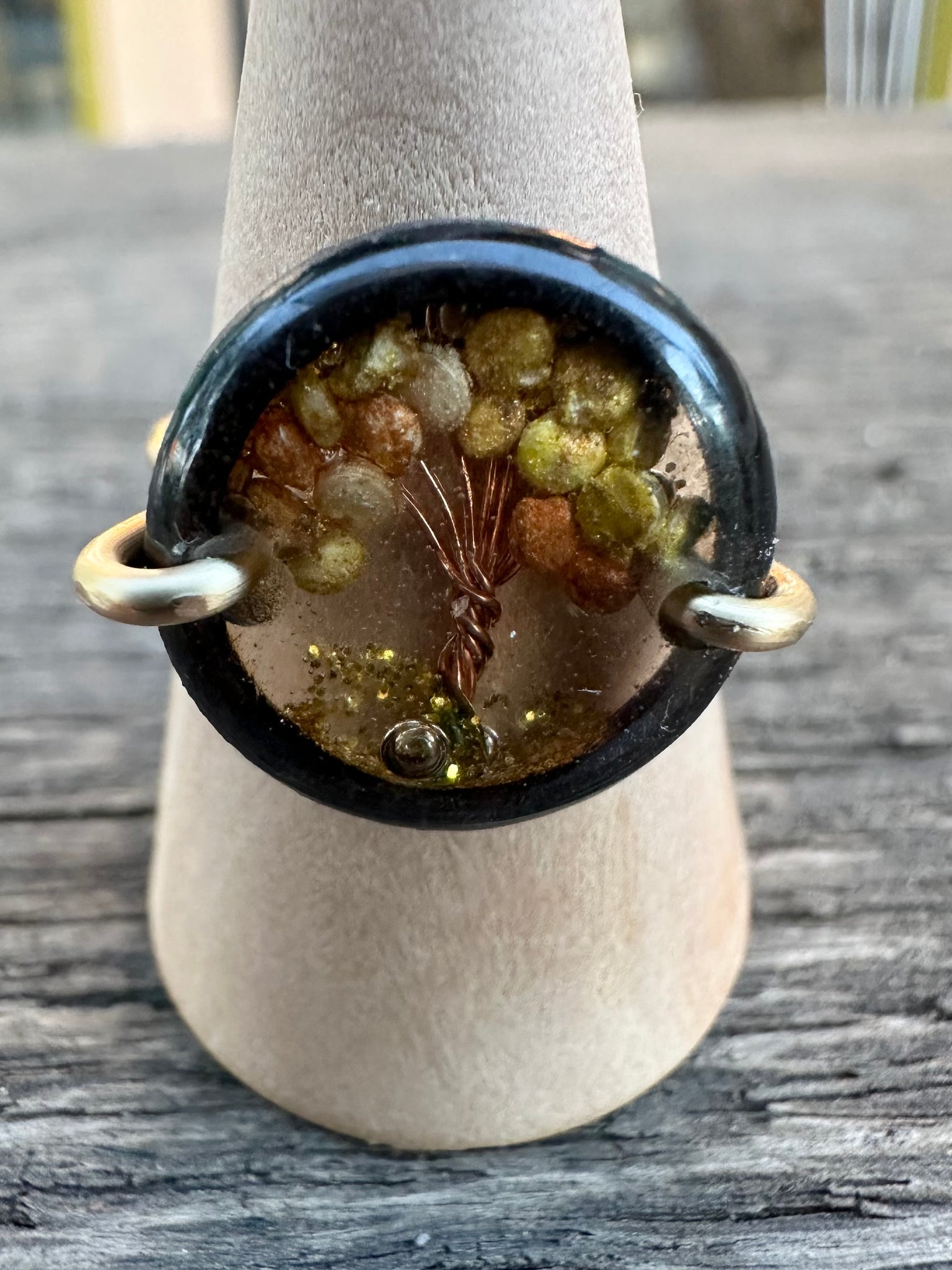 A wire wrapped tree encased in resin and set inside of wood with a brass band. Size 7