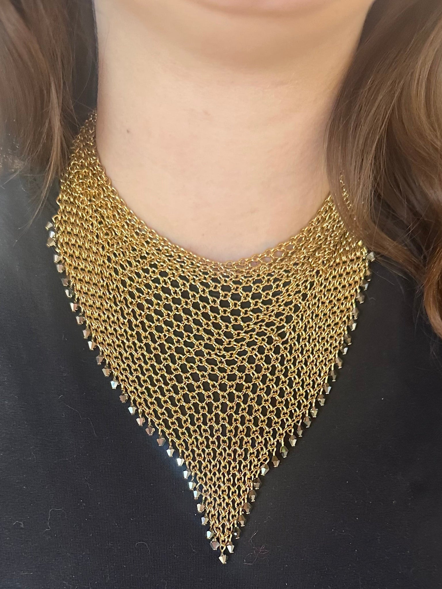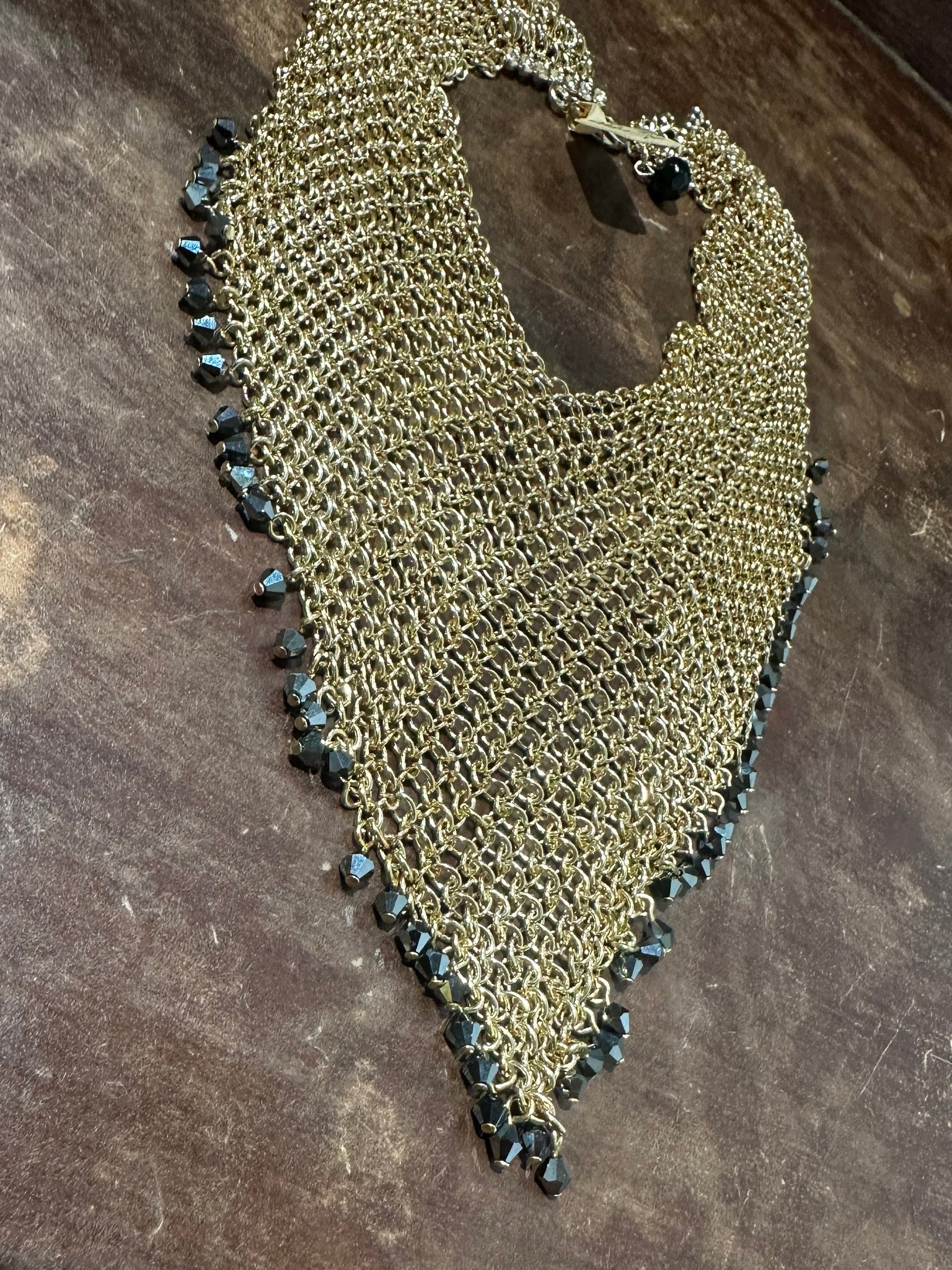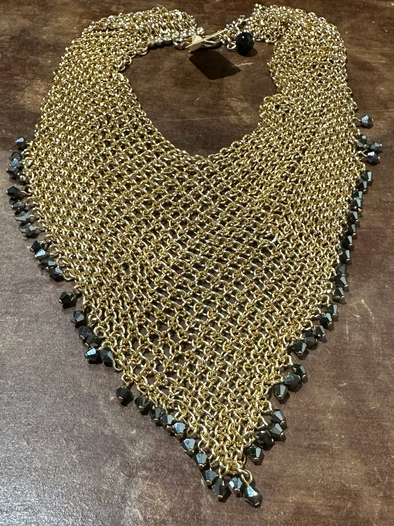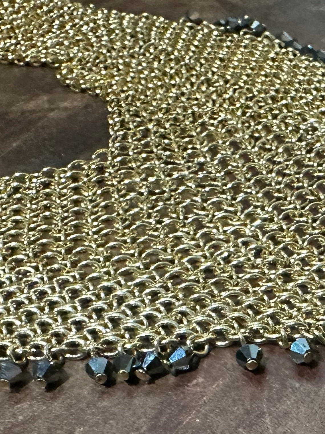 A dramatic gold-tone chain mail mesh necklace edged in charcoal rhinestones. In excellent vintage condition, it measures 16 inches with a 4 inch extender