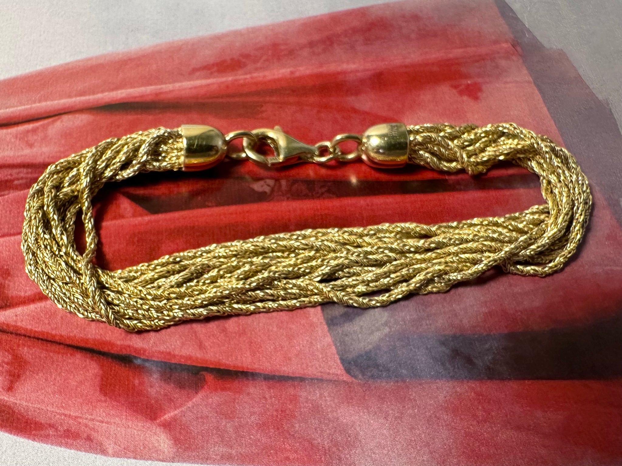 This lovely bracelet is vintage yet has a very modern look. Multi strands of 14 K gold fill chain with a gold plated over sterling clasp. This is a larger size bracelet, 7 1/2 inches long.