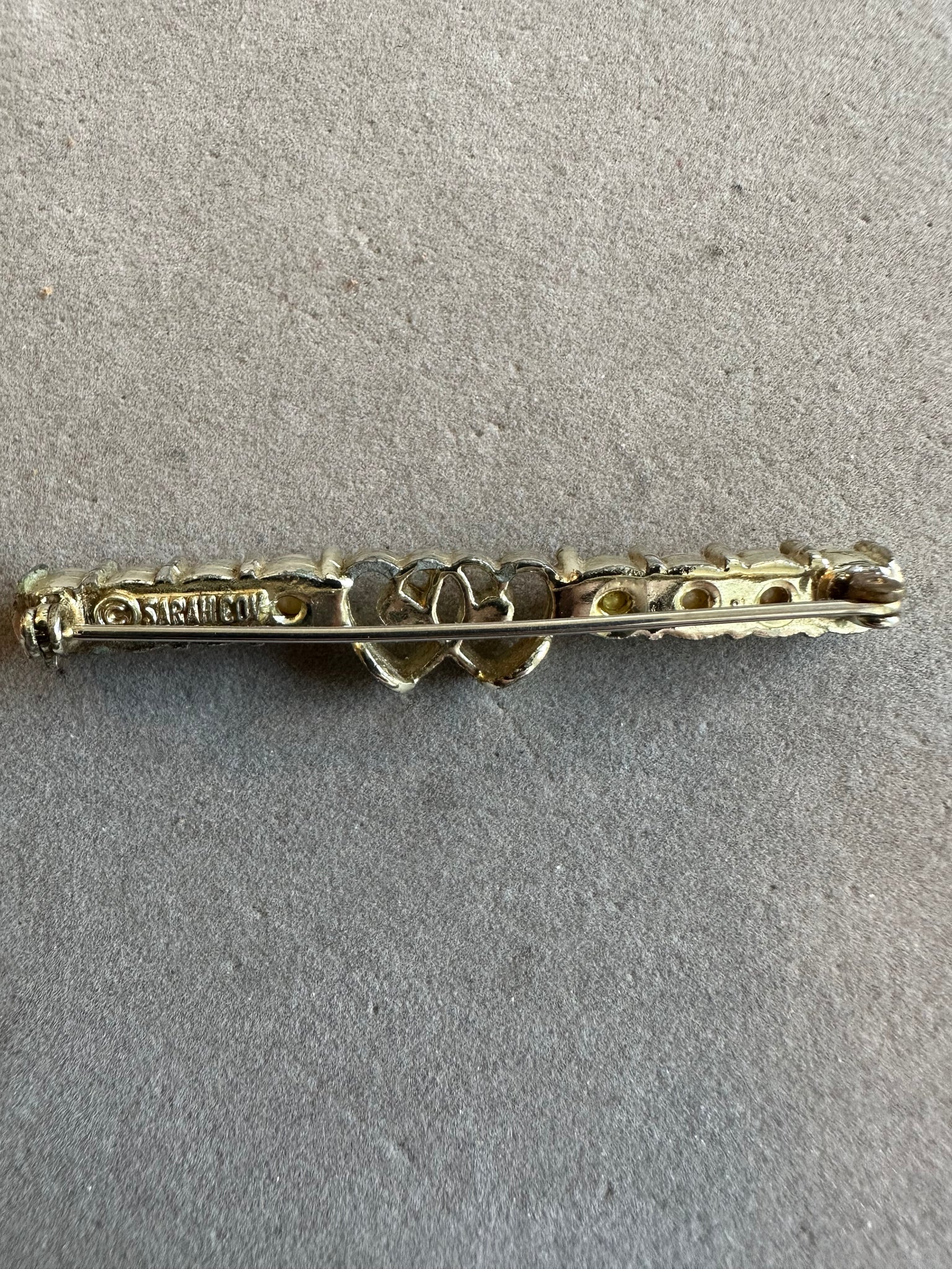This is a vintage Sarah Coventry "Waltz Time" bar brooch with faux pearls and two intertwined hearts with aurora borealis rhinestones.
