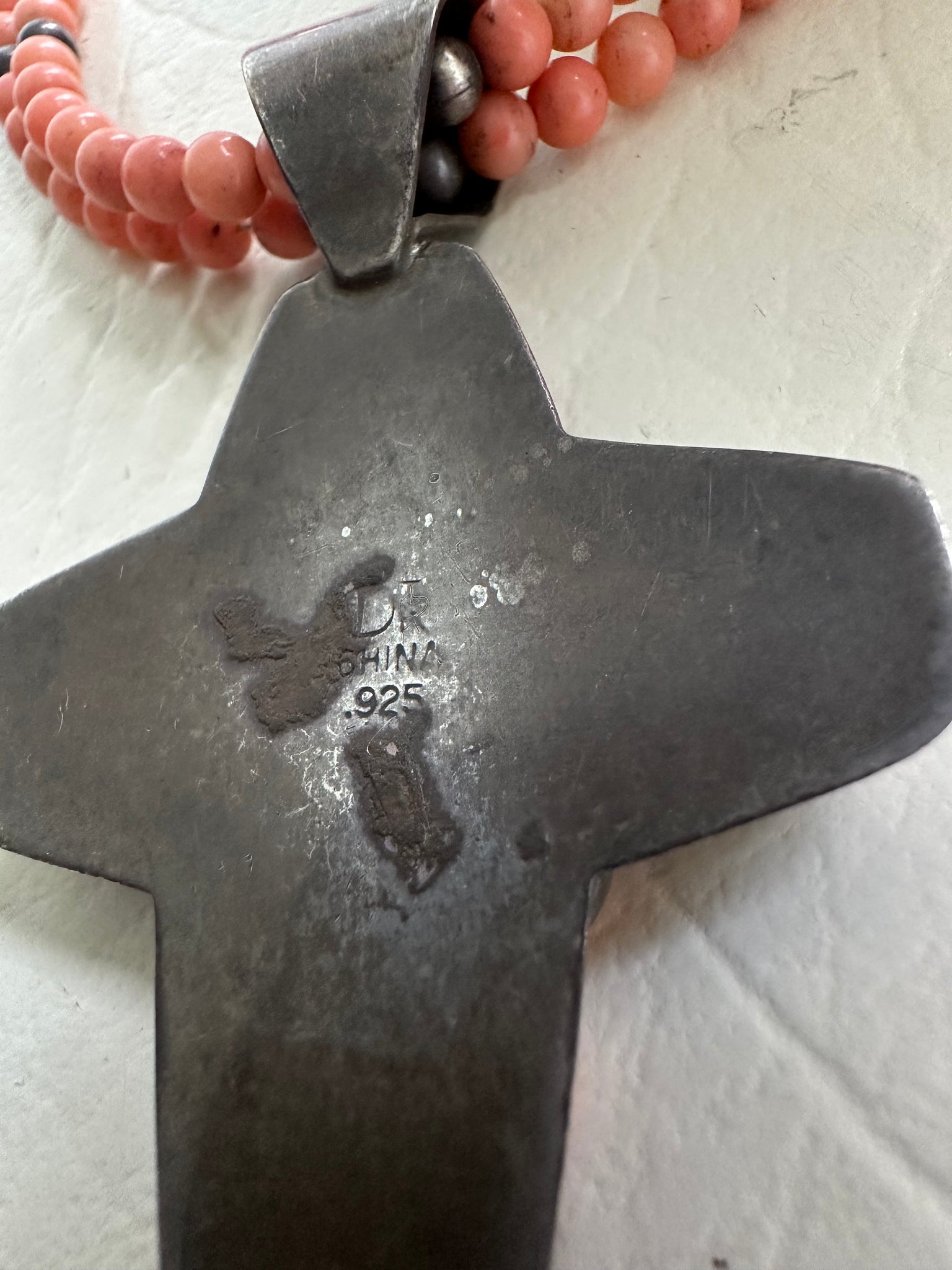 This stunning vintage Sterling silver cross necklace features bezel set coral gemstones. It is strung on a double natural coral necklace. The cross can easily be taken off and worn on a chain or cord. This was created by Jay King, Desert Rose Trading Company