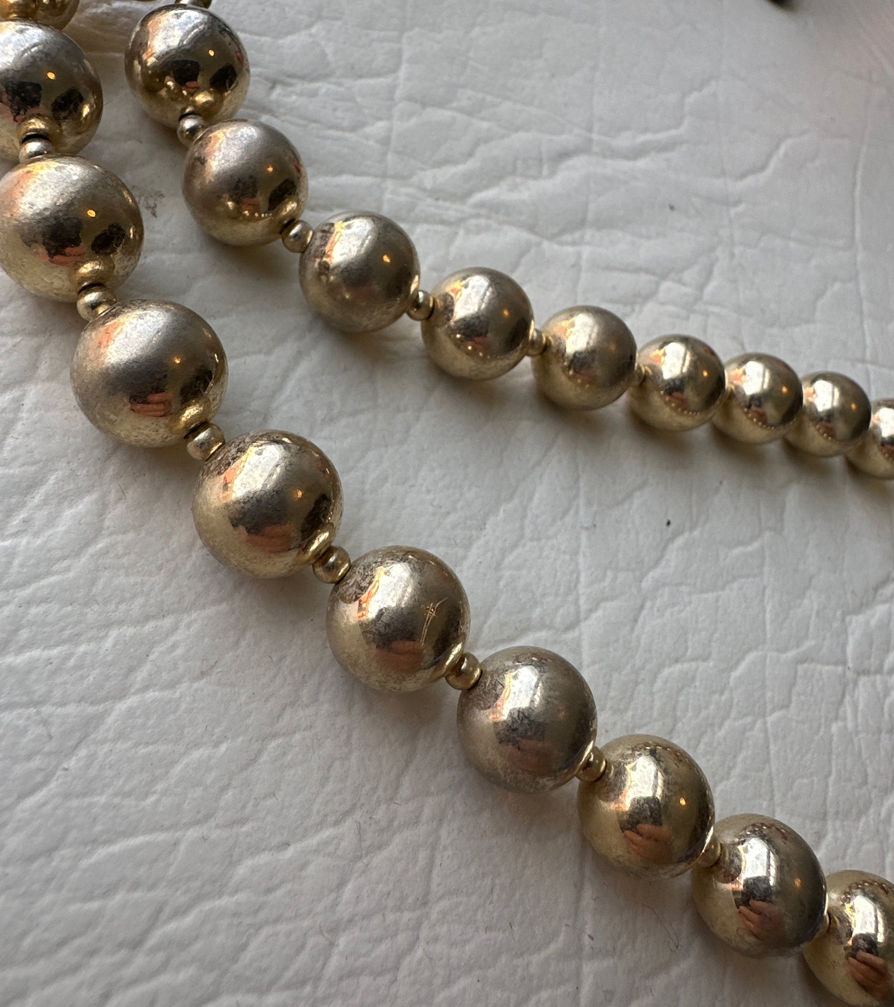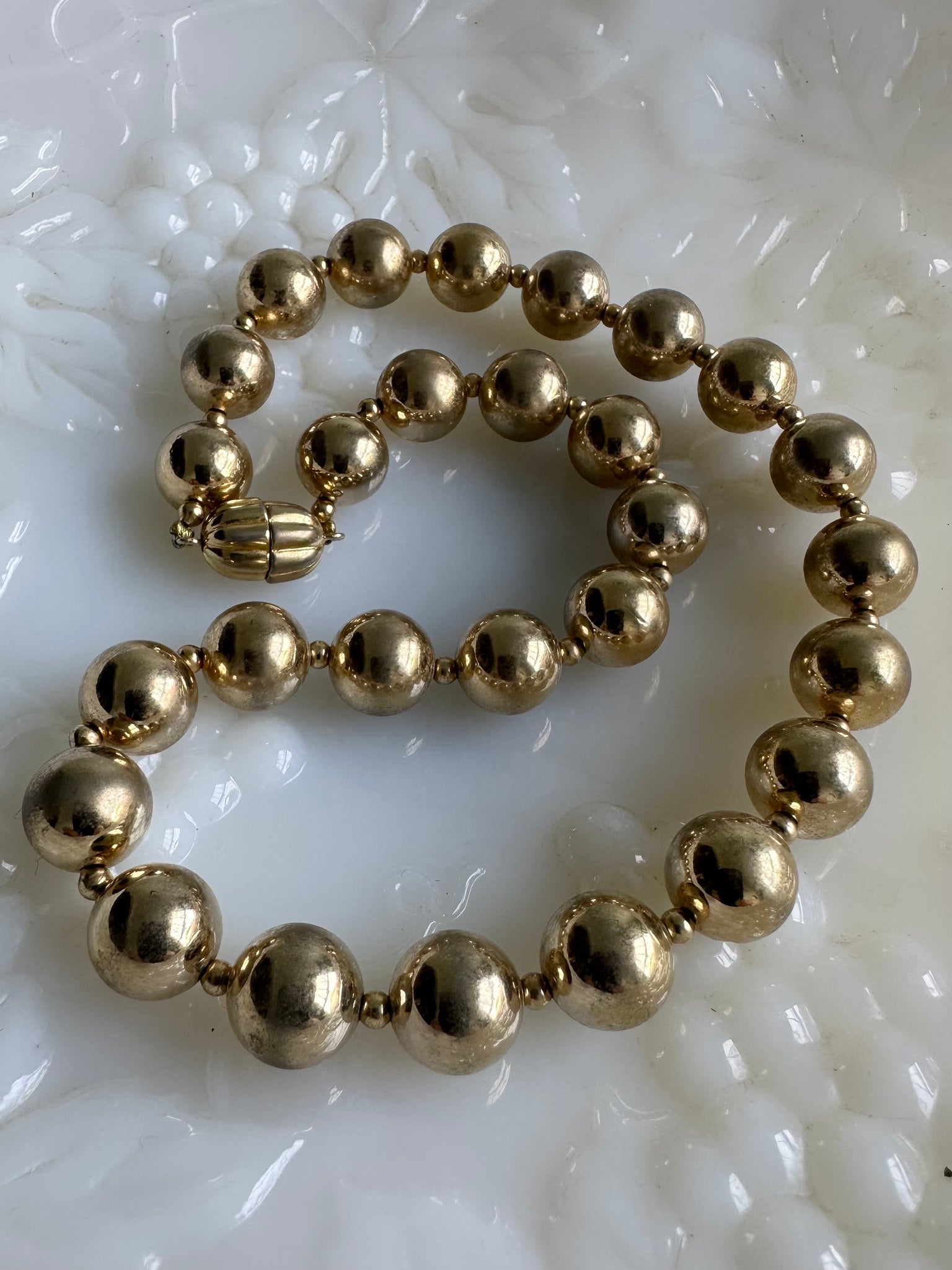 Vintage gold-tone graduated ball bead necklace, circa 1960s–1970s, finished with a substantial screw barrel clasp.