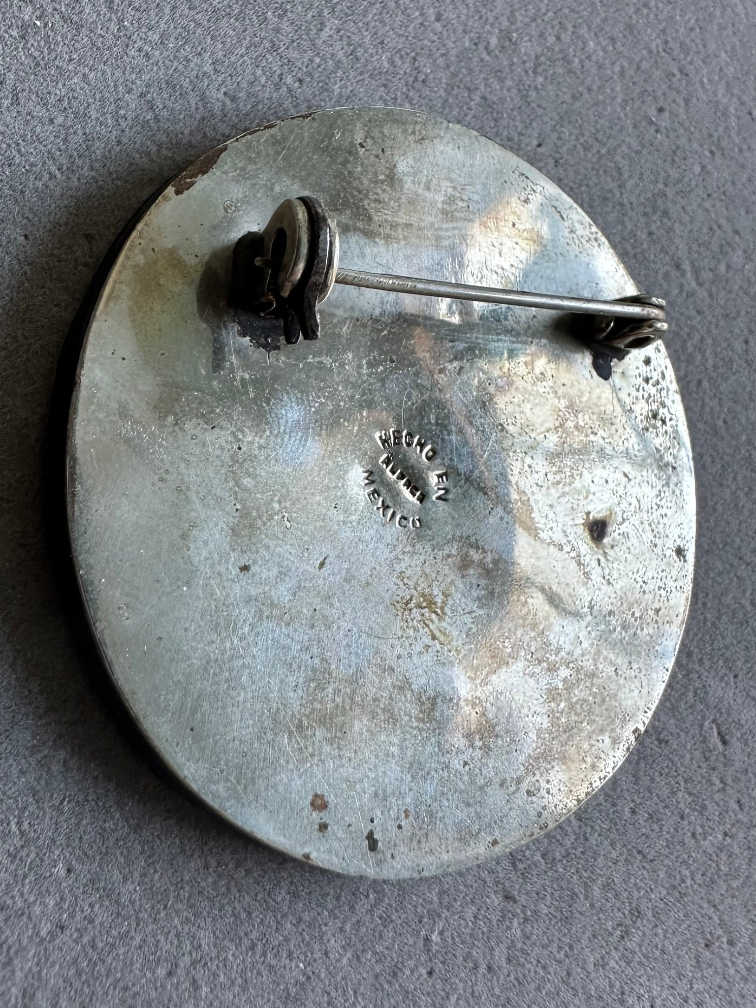 Vintage Mexican Alpaca silver marked large brooch that is set with a large gold colored coin with a Mayan calendar design.