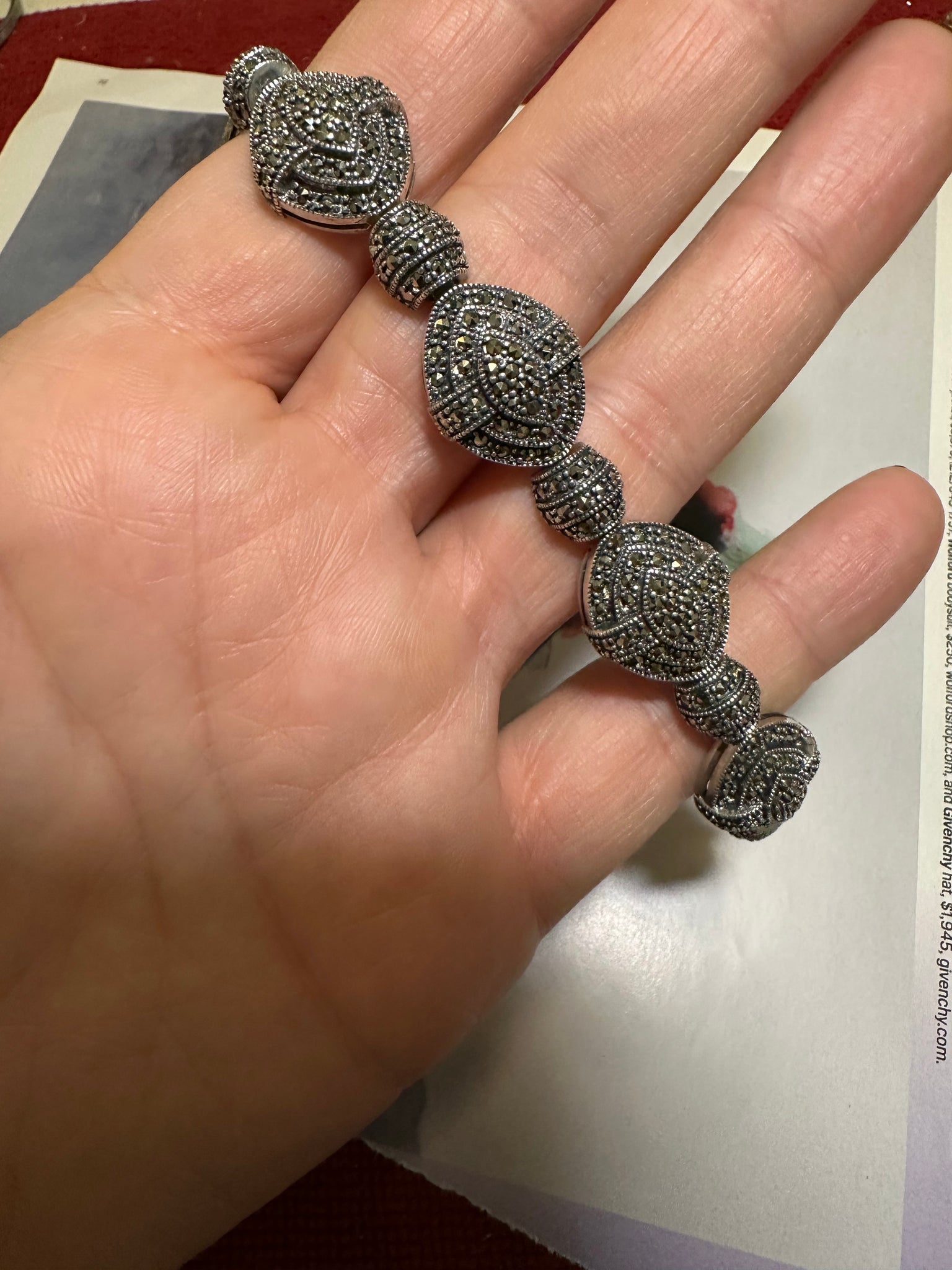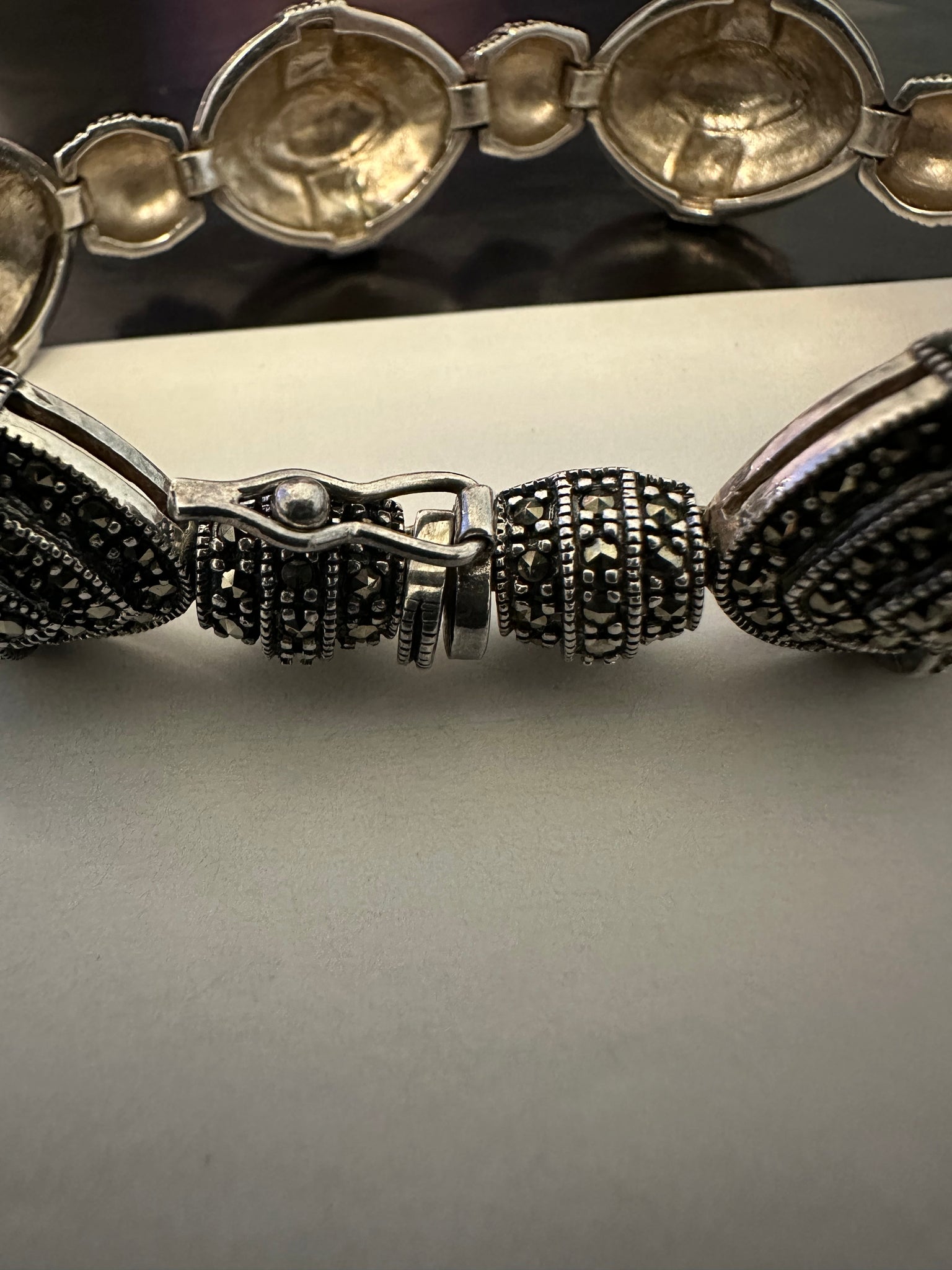 This gorgeous sterling silver bracelet was made in Thailand. It’s in impeccable shape, all of the marcasite is sparkly and it has a safety clasp, so you won’t lose it!
